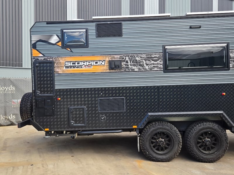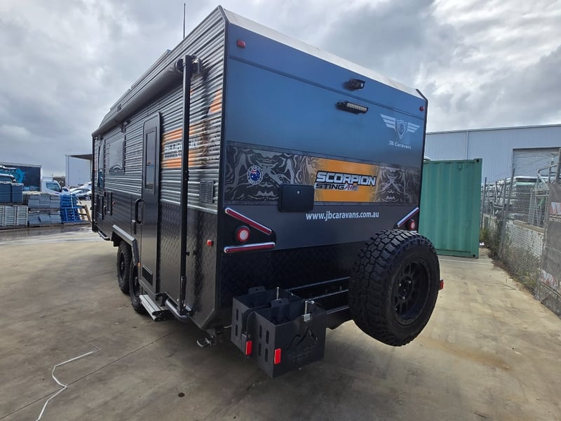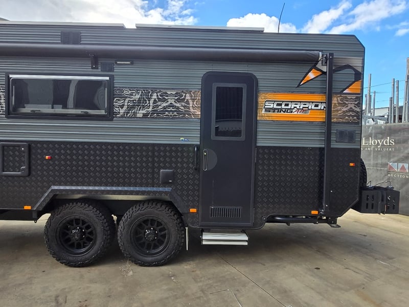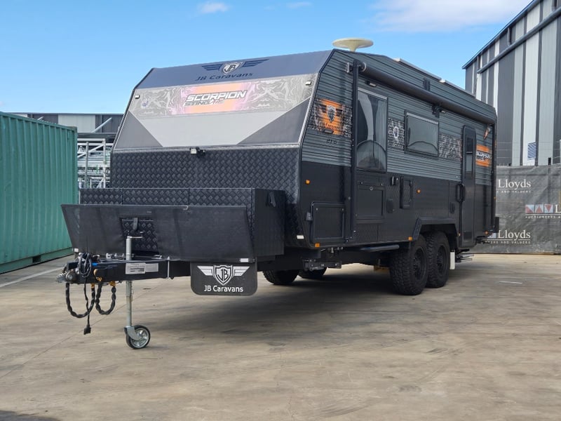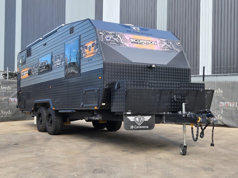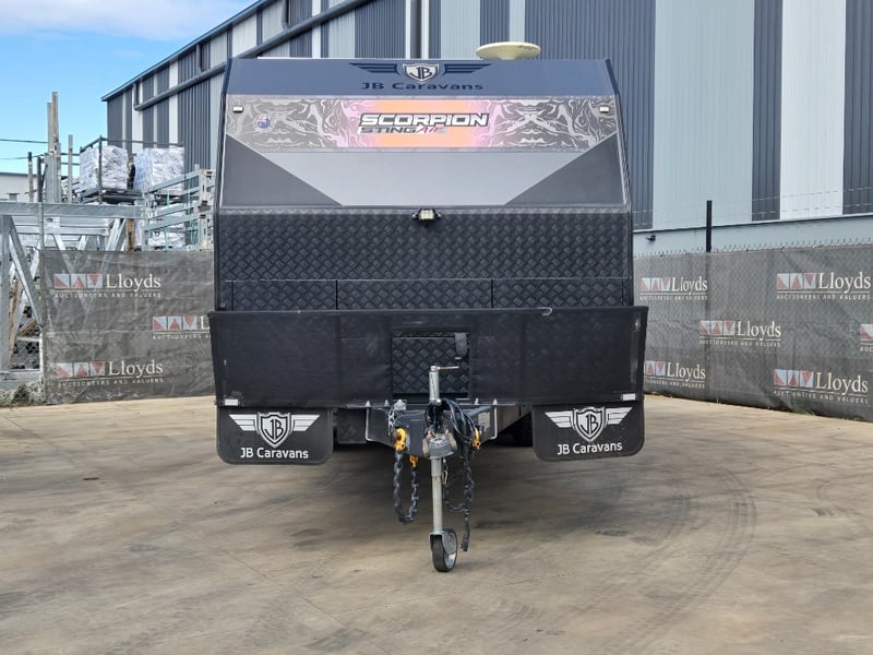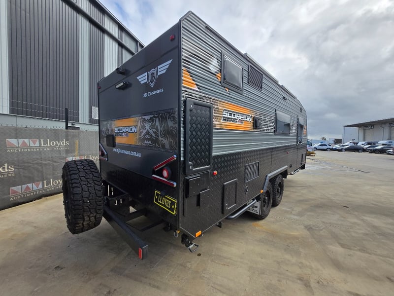 **2023 JB Caravans Scorpion Sting Air Year: 2023 Make: JB Caravans Model: Scorpion Sting Air Body: Caravan Colour: Black/Grey/Orange Configuration: Dual Axel Tare: 3059 kg ATM: 4500 kg Description/ extras: stove, sink, double Bed, inside toilet, inside shower, wash machine, and more. VIN: 6P45AFOR2PC000198 Key# B40 Lloyds stock #990553+1 #Ajax #MMR