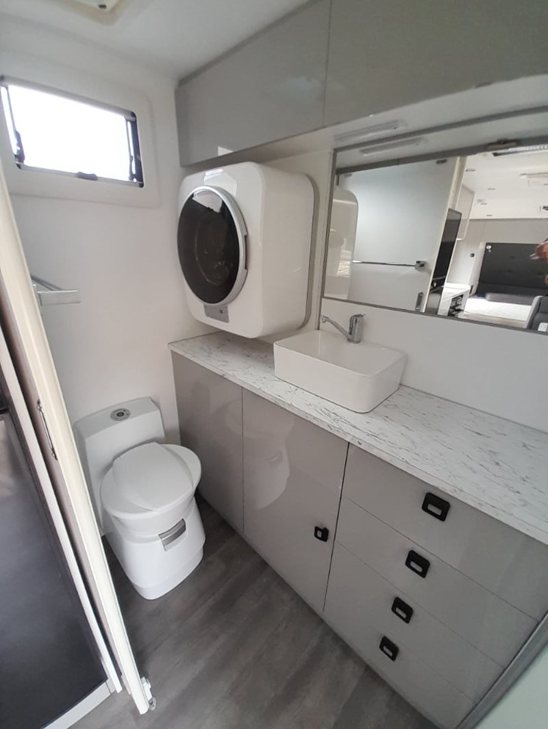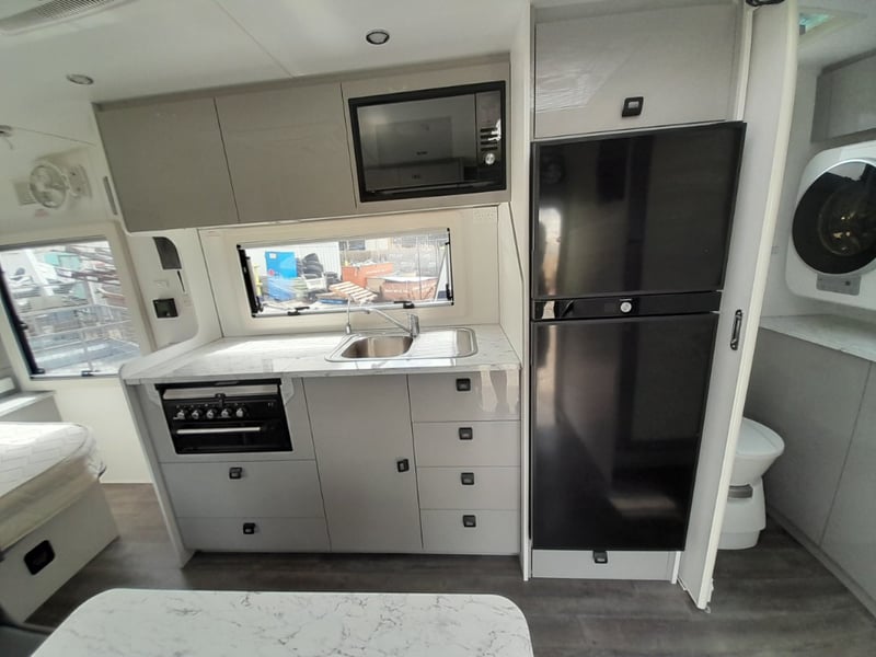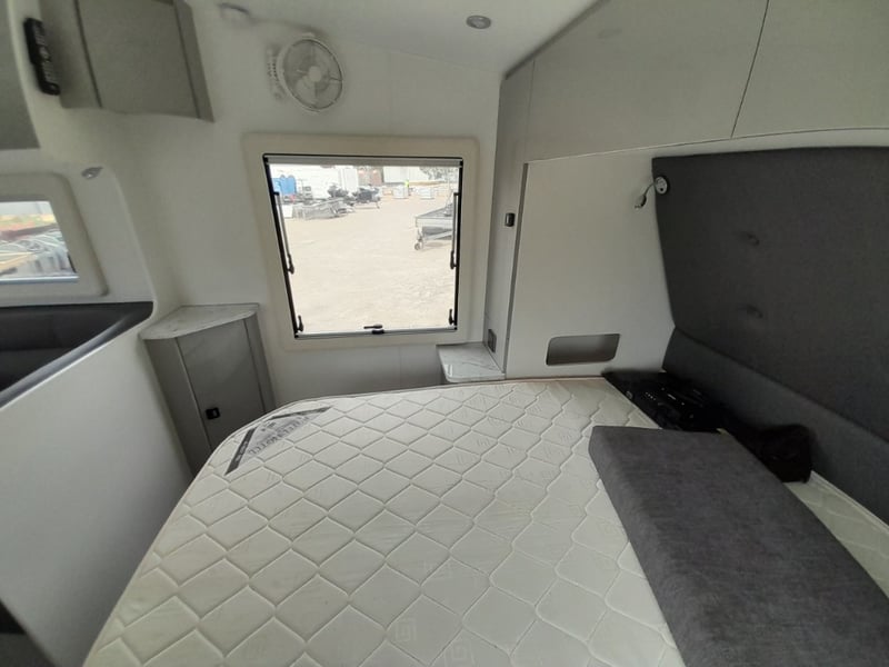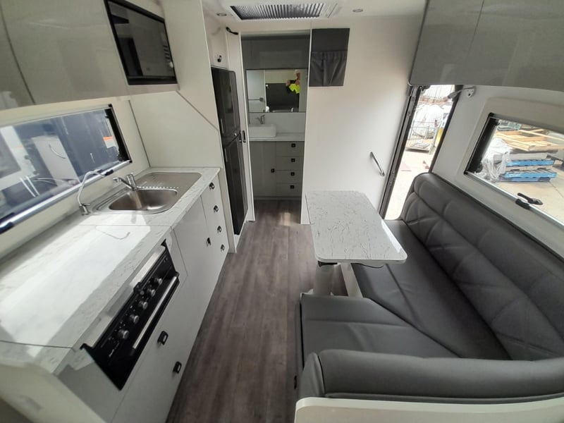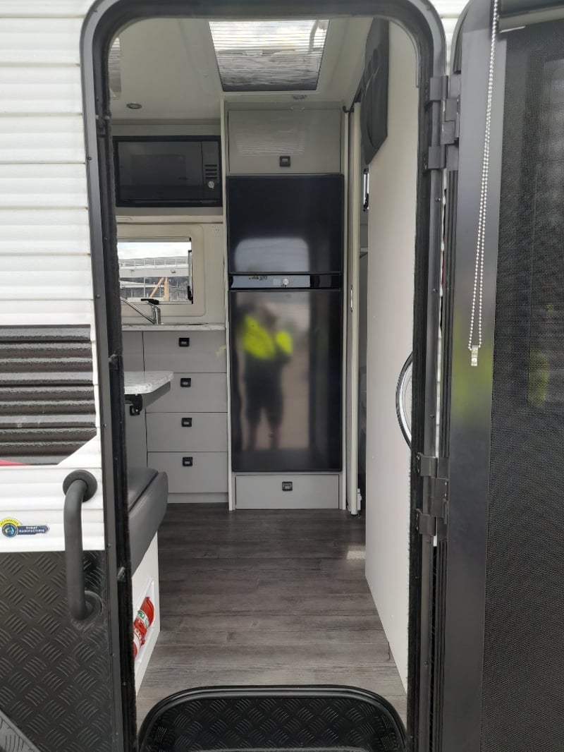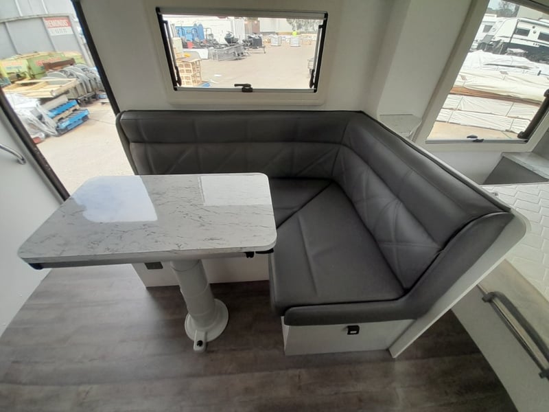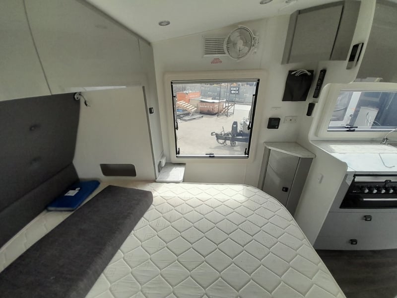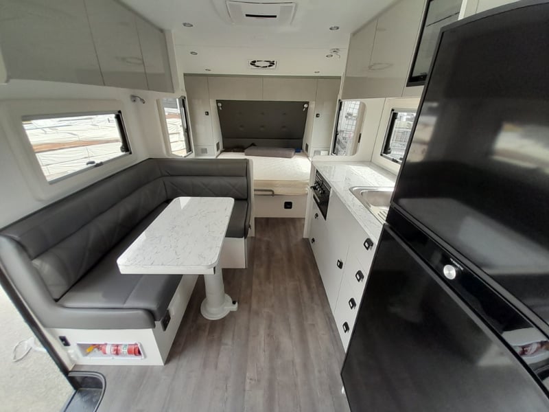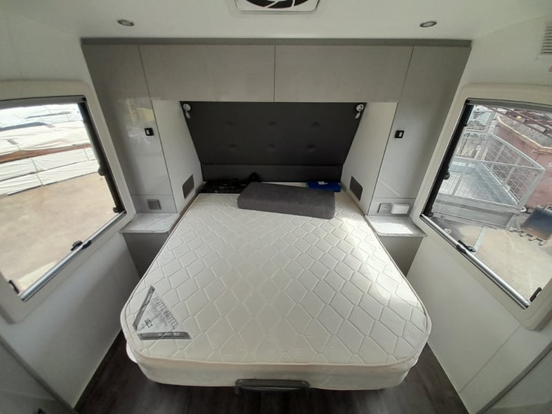 Description/ extras: Queen bed, TV, Overhead storage, bedside USB and plugs, air-conditioning, fans, kitchenette with grill and 3 burner stove top, sink, fridge and freezer, microwave, booth seating and table, bathroom with toilet, shower and 3kg washing machine, storage throughout, fire extinguisher, external storage, fold out picnic table, slide out draw, inlet and outlet plugs, external shower, tankless water heater, spare wheel.