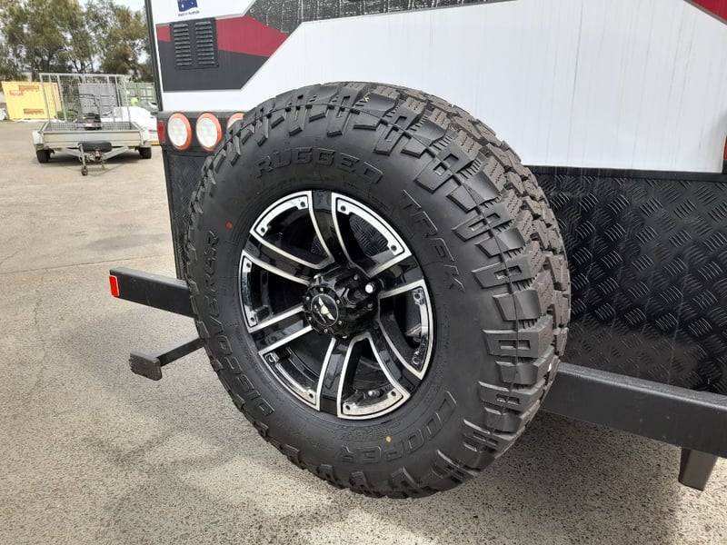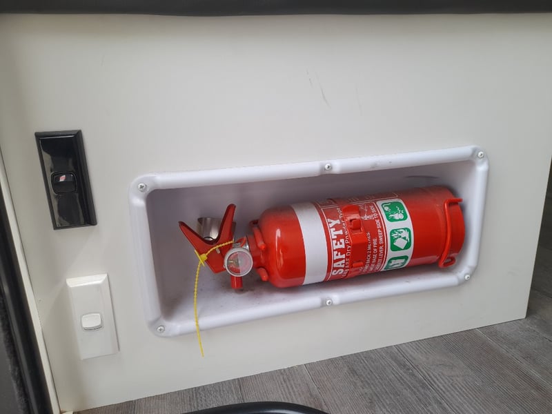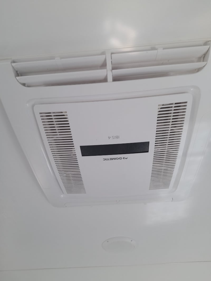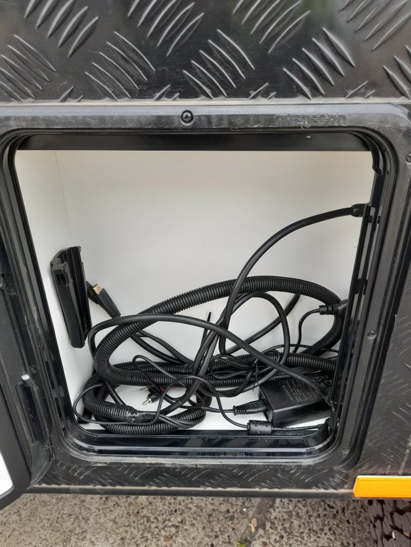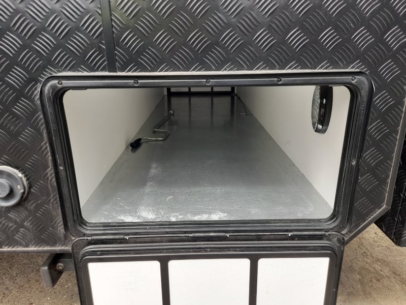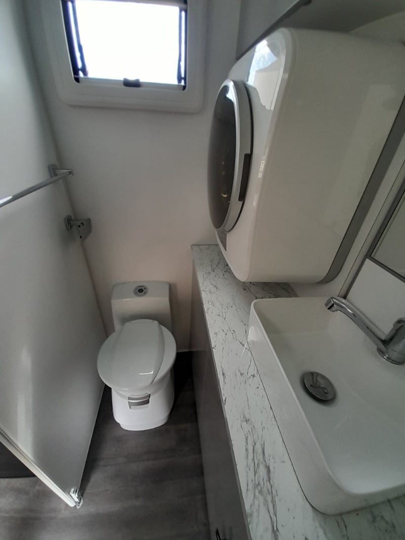 Description/ extras: Queen bed, TV, Overhead storage, bedside USB and plugs, air-conditioning, fans, kitchenette with grill and 3 burner stove top, sink, fridge and freezer, microwave, booth seating and table, bathroom with toilet, shower and 3kg washing machine, storage throughout, fire extinguisher, external storage, fold out picnic table, slide out draw, inlet and outlet plugs, external shower, tankless water heater, spare wheel.