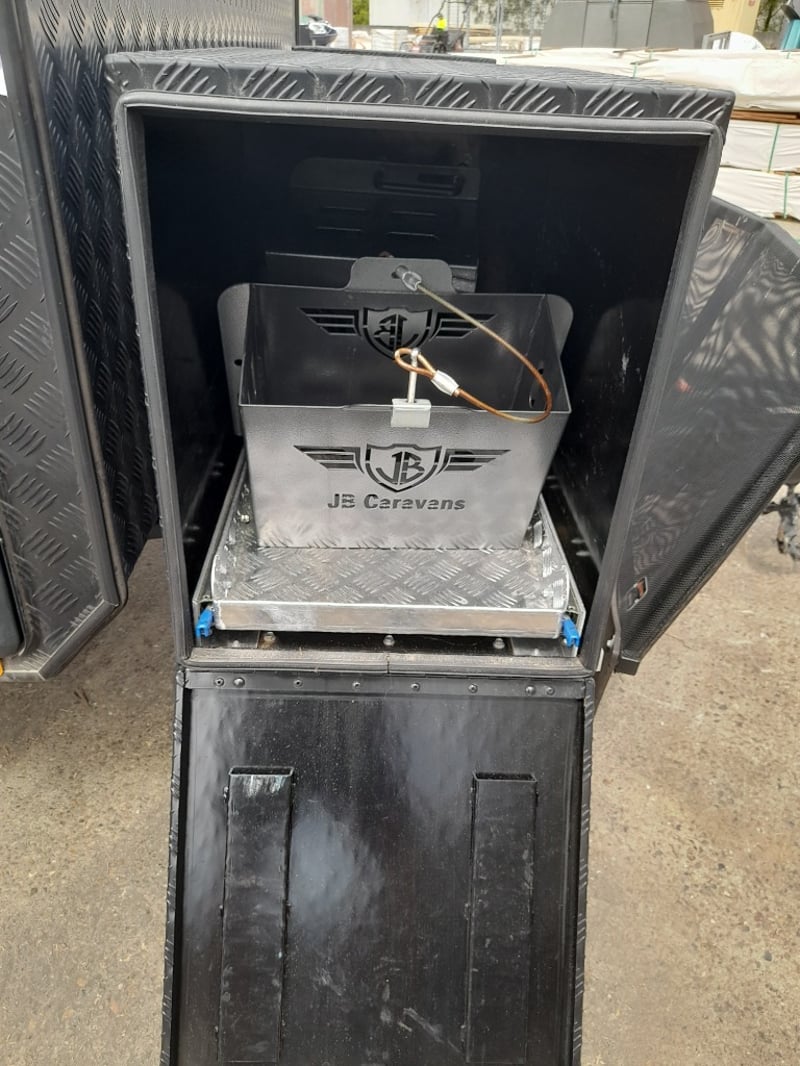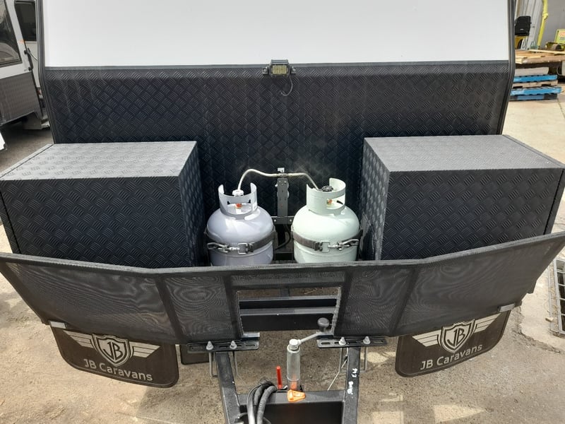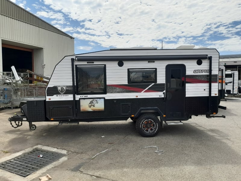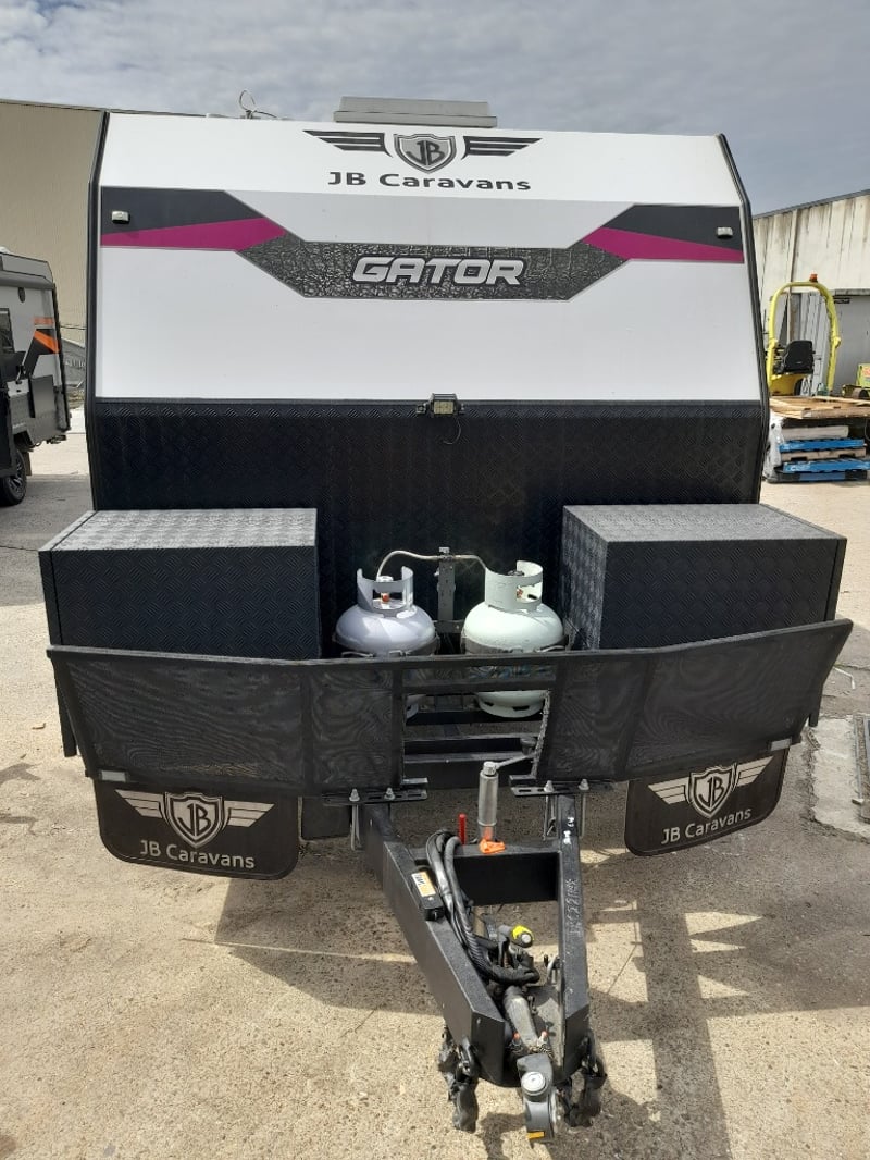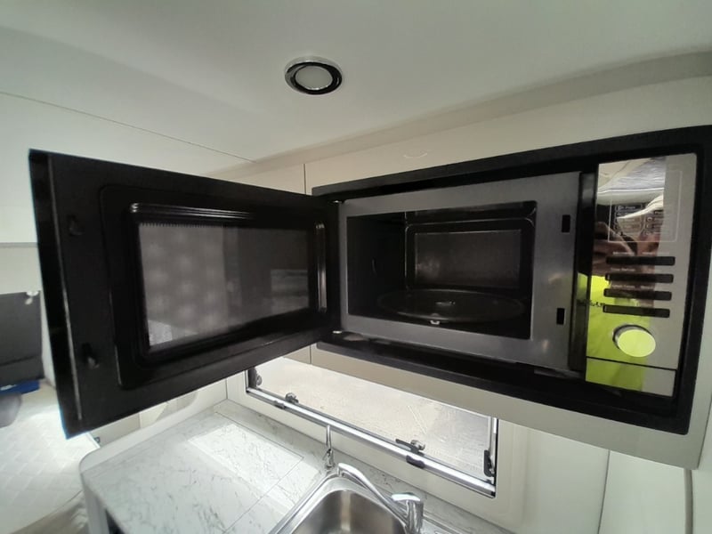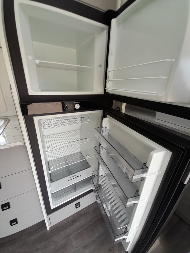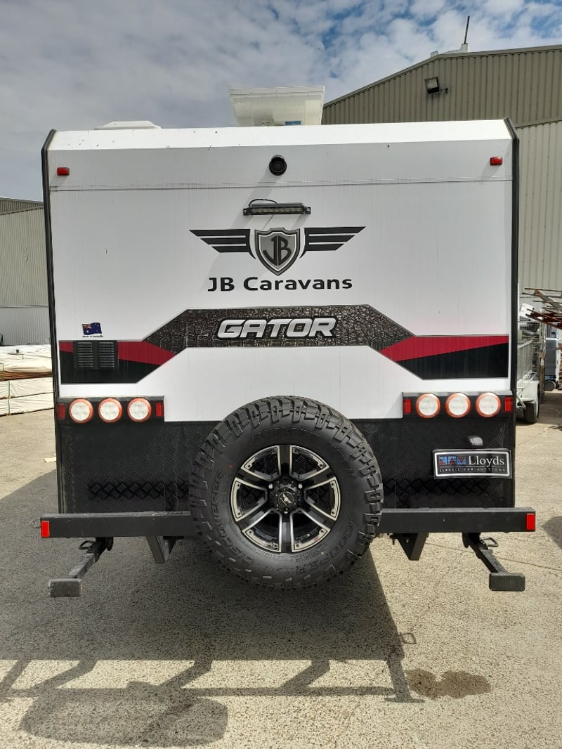 Description/ extras: Queen bed, TV, Overhead storage, bedside USB and plugs, air-conditioning, fans, kitchenette with grill and 3 burner stove top, sink, fridge and freezer, microwave, booth seating and table, bathroom with toilet, shower and 3kg washing machine, storage throughout, fire extinguisher, external storage, fold out picnic table, slide out draw, inlet and outlet plugs, external shower, tankless water heater, spare wheel.