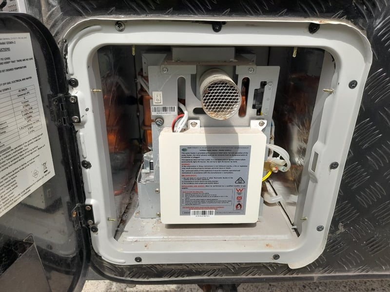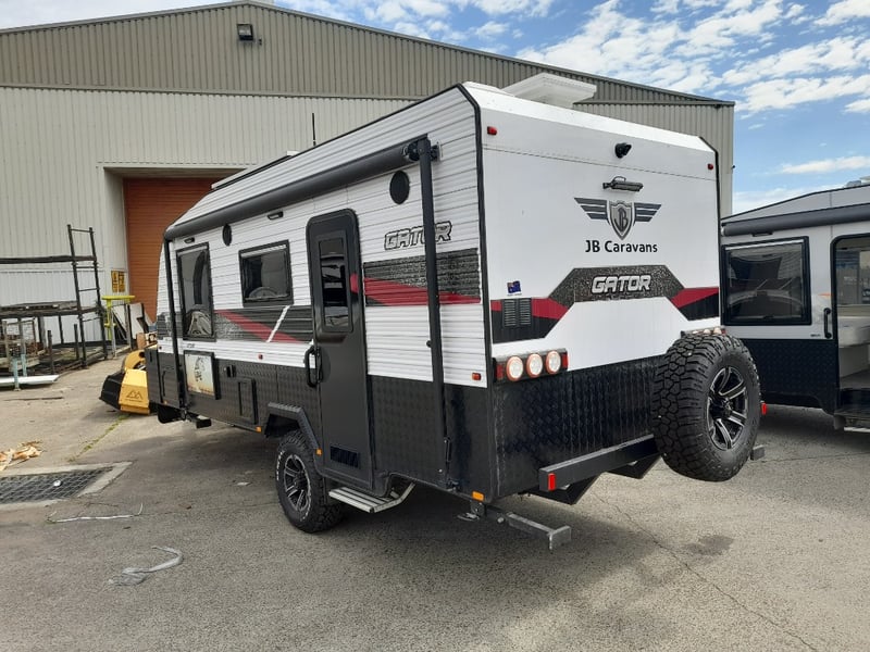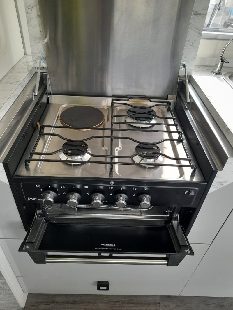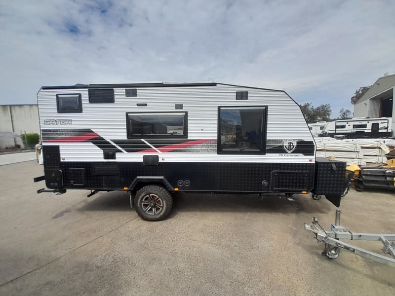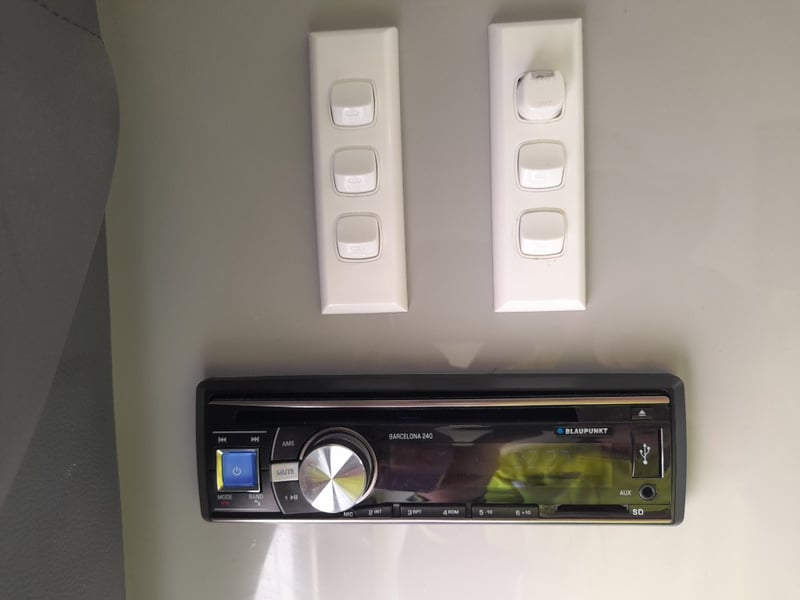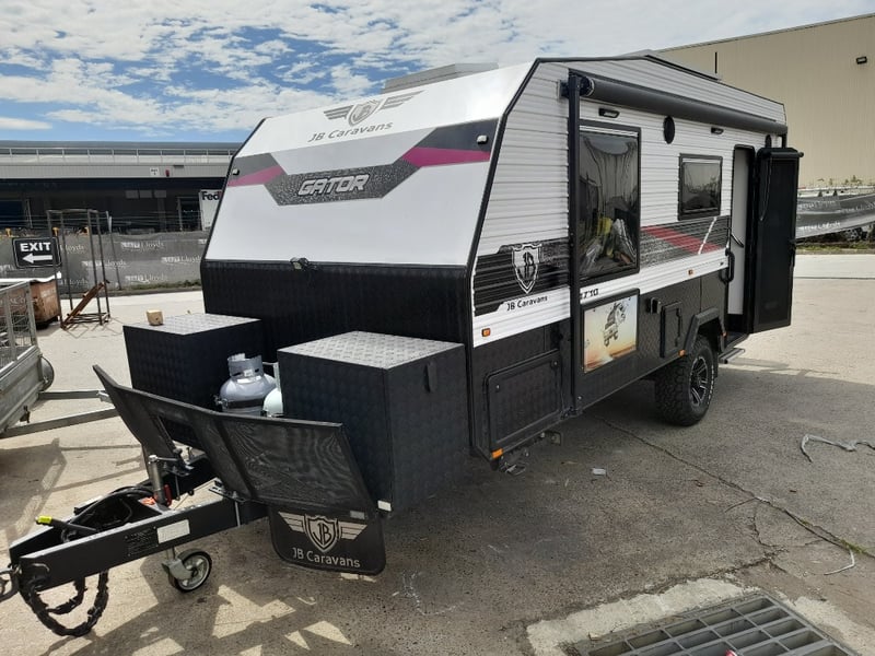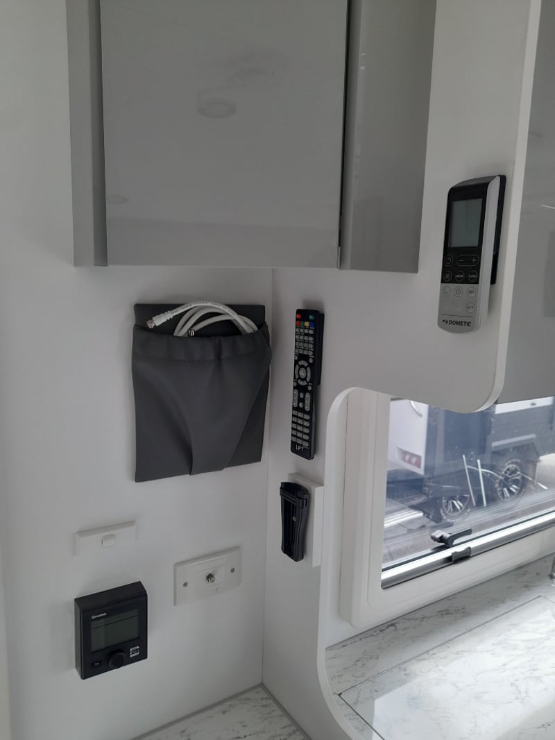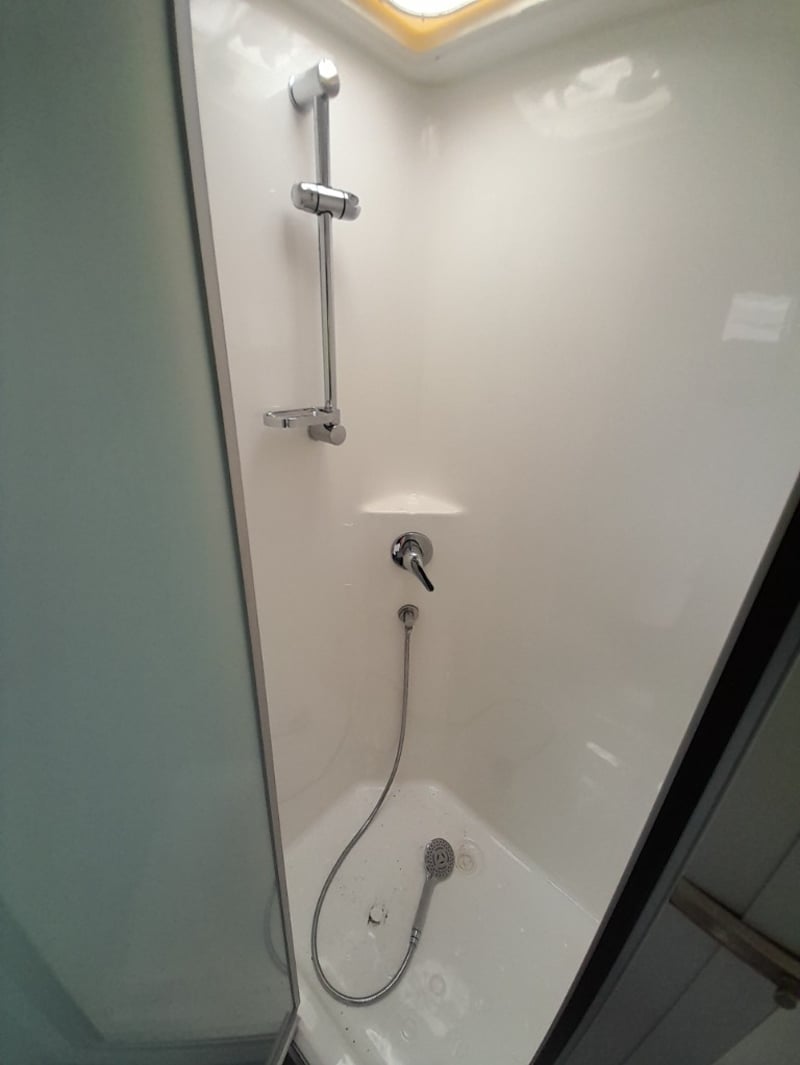 Description/ extras: Queen bed, TV, Overhead storage, bedside USB and plugs, air-conditioning, fans, kitchenette with grill and 3 burner stove top, sink, fridge and freezer, microwave, booth seating and table, bathroom with toilet, shower and 3kg washing machine, storage throughout, fire extinguisher, external storage, fold out picnic table, slide out draw, inlet and outlet plugs, external shower, tankless water heater, spare wheel.