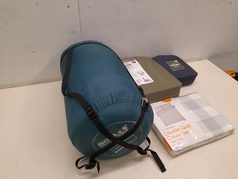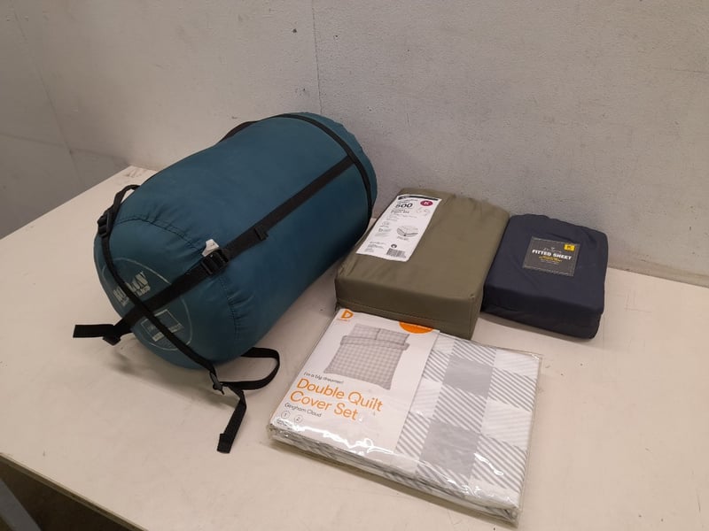 Assorted bedding, Roman sleeping bag, fitted cotton sheets, double quilt cover set