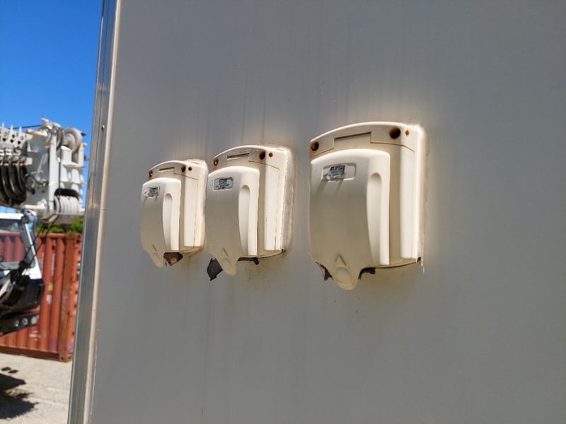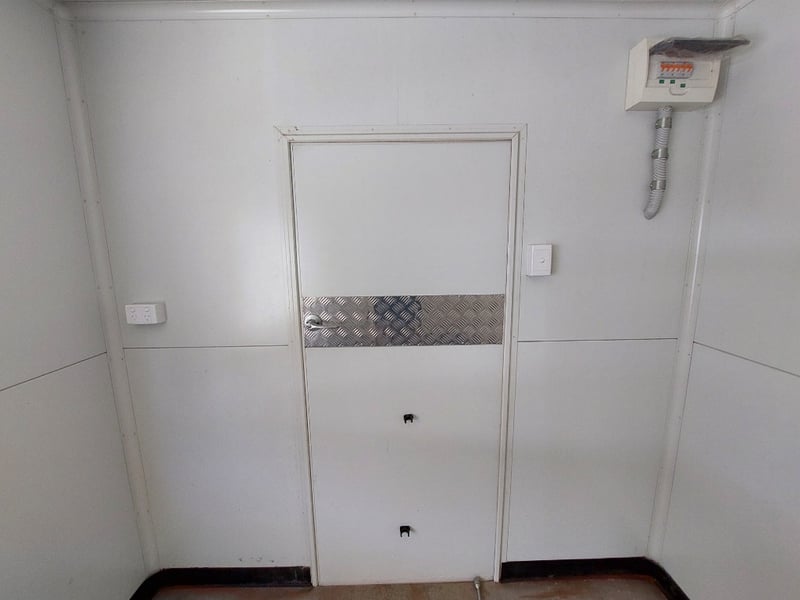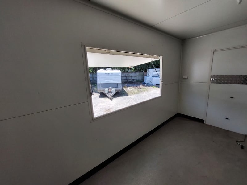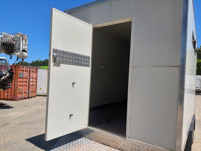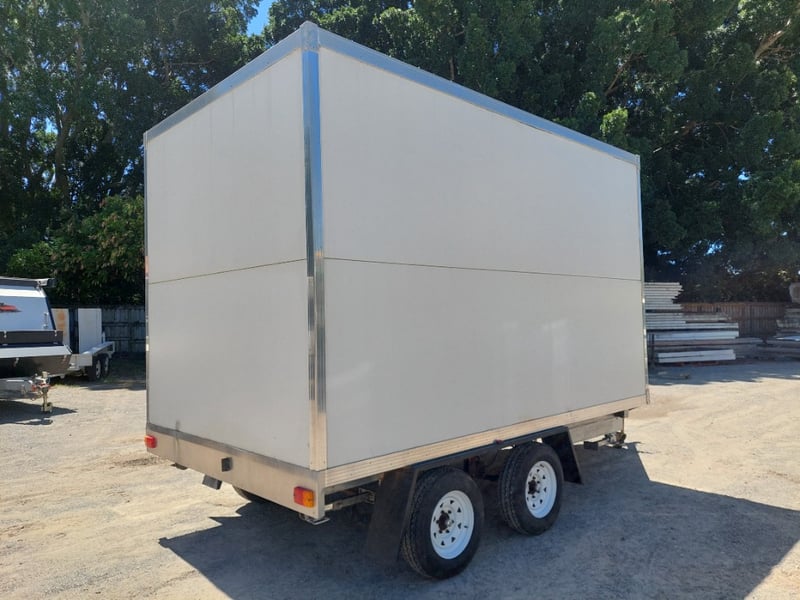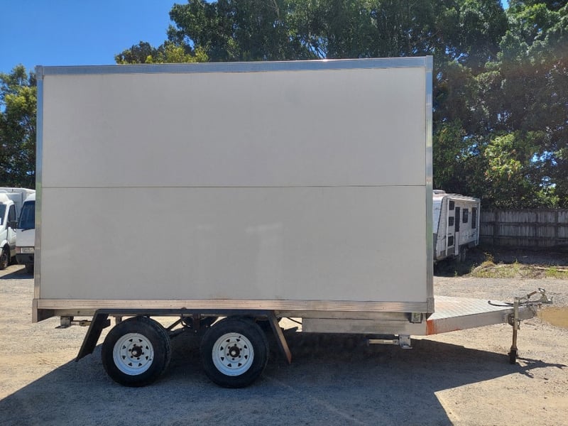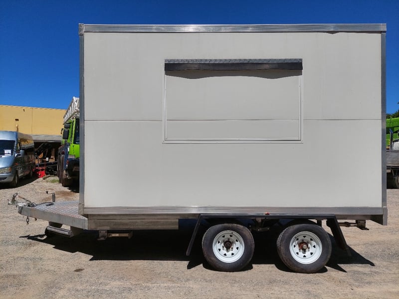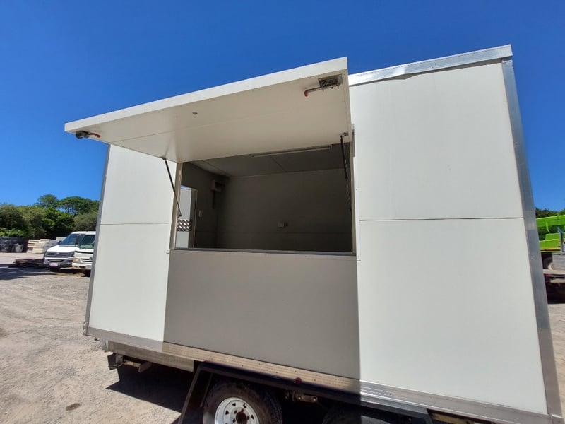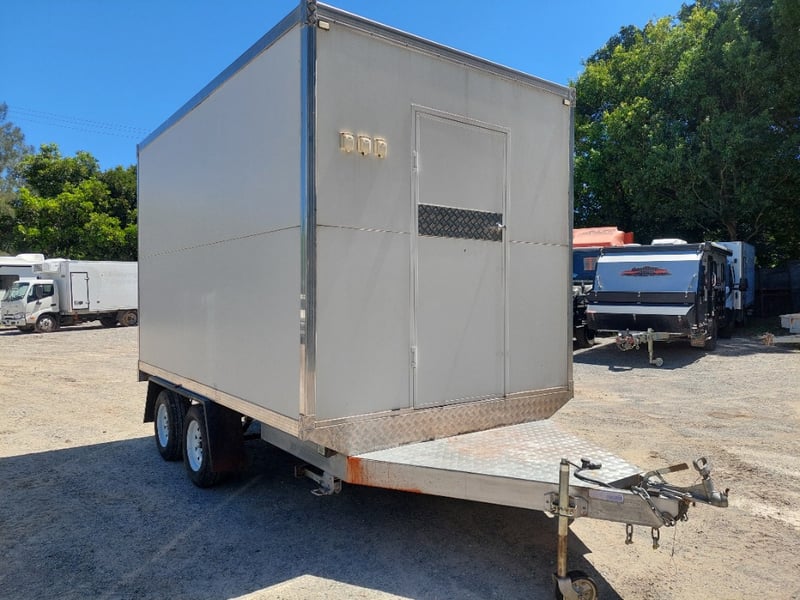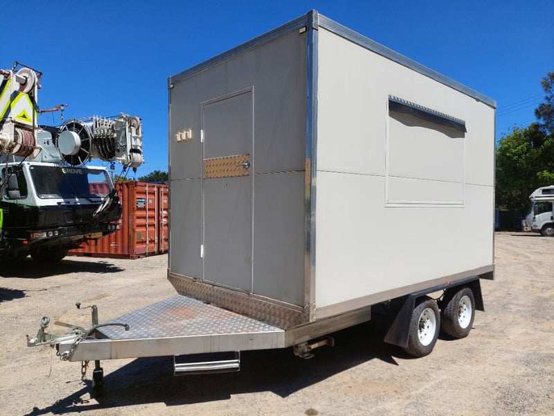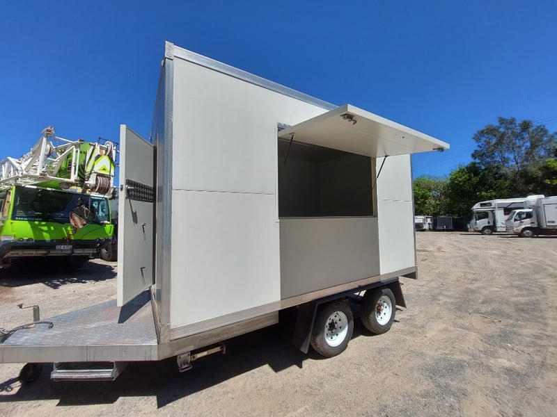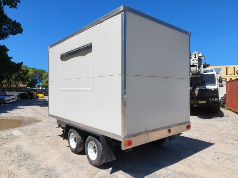 Description: Front Access Door, No Keys (Door Unkocked), Side Serving Door, Breakaway Electric Brakes, 4 Stabiliser Legs, Dual Axle Load Sharing, Wired For 240v