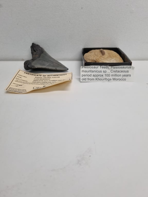 Plesio Teeth,Plesiosaurus mauritanicus sp, Cretaceous perion approx 100 million years old Khouribga Morroco and Fossil Shark Tooth wiyh Certificate of Authenticity. Sold as lot