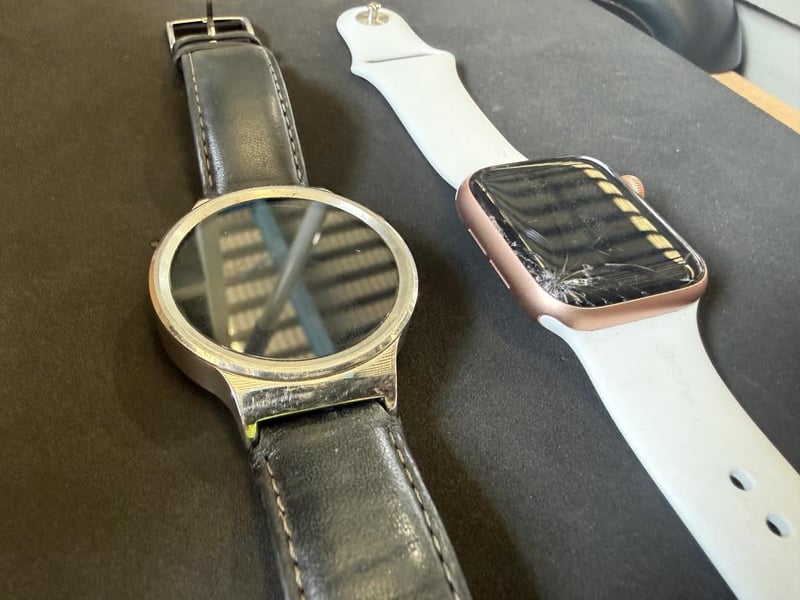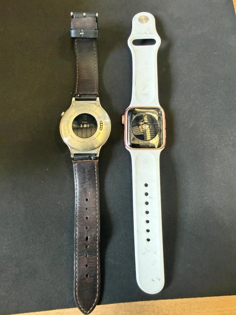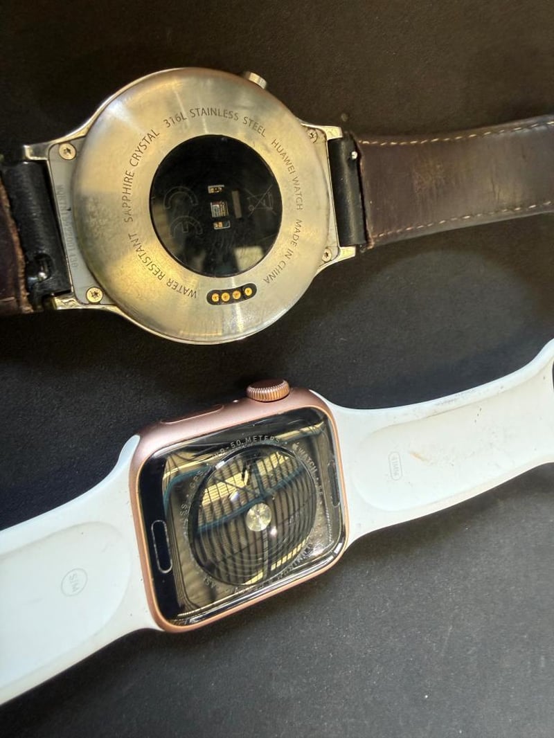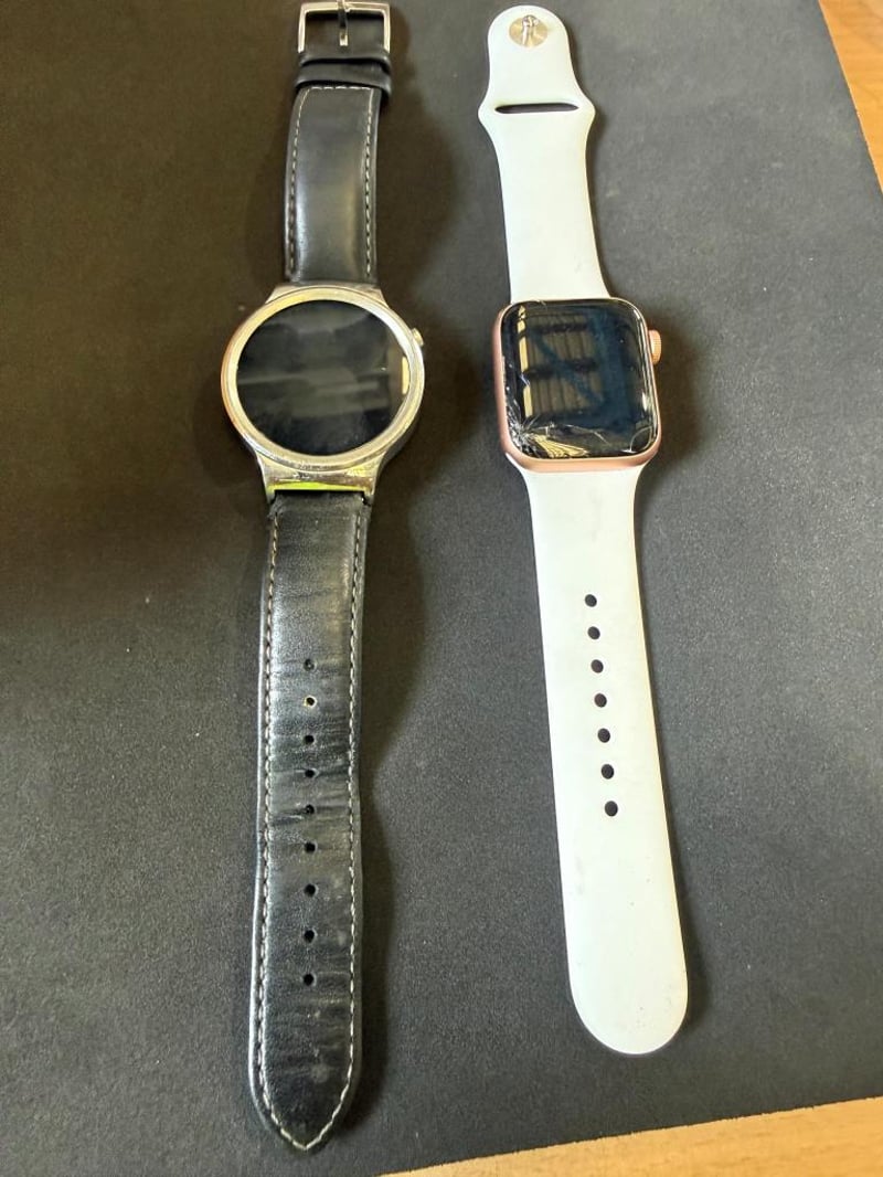 Apple Watch SE 40mm & Huawei W1 Stainless Steel Smart Watch NOTE: UNKOWN WORKING CONDITION, SUGGESTED FOR PARTS ONLY NOTE: MARKS AND CRACKS (REFER TO PHOTOS)