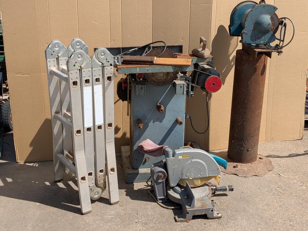 Tools, includes foldout ladder, stand alone grinder and more Sold as lot