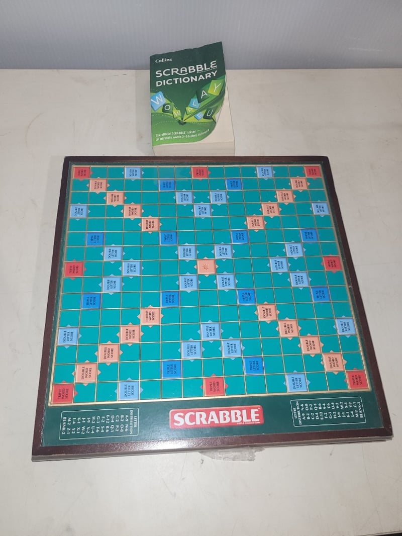 Classic Scrabble Game and Scrabble Dictionary. Wooden Playing Board. Some Pieces may be Missing. SOLD as LOT.
