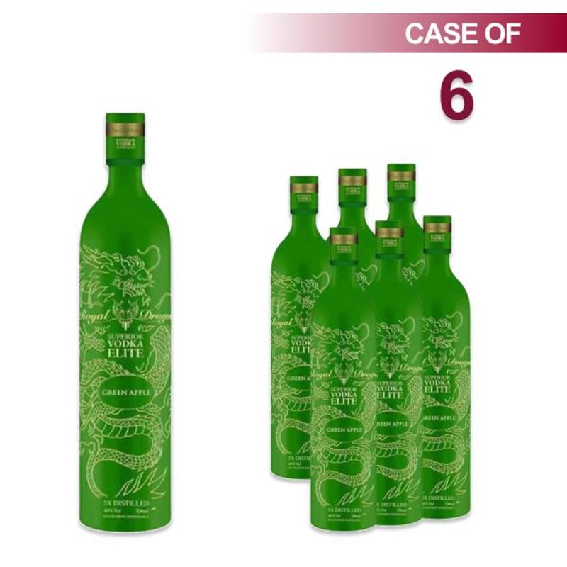 Case x6 Green Apple Royal Dragon Superior Elite Vodka, 700ml Bottles, RRP $594 Five times distilled this super premium Vodka, exclusively distilled with a Russian formula from the finest winter harvest rye. Tasting Note: Its fruity and refreshing vodka with a sweet and sour taste, perfect for your palette. Green Apple vodka has a fruity and refreshing flavour with a sweet and sour aftertaste. Royal Dragon’s Flavoured Collection is elegant and sumptuous.