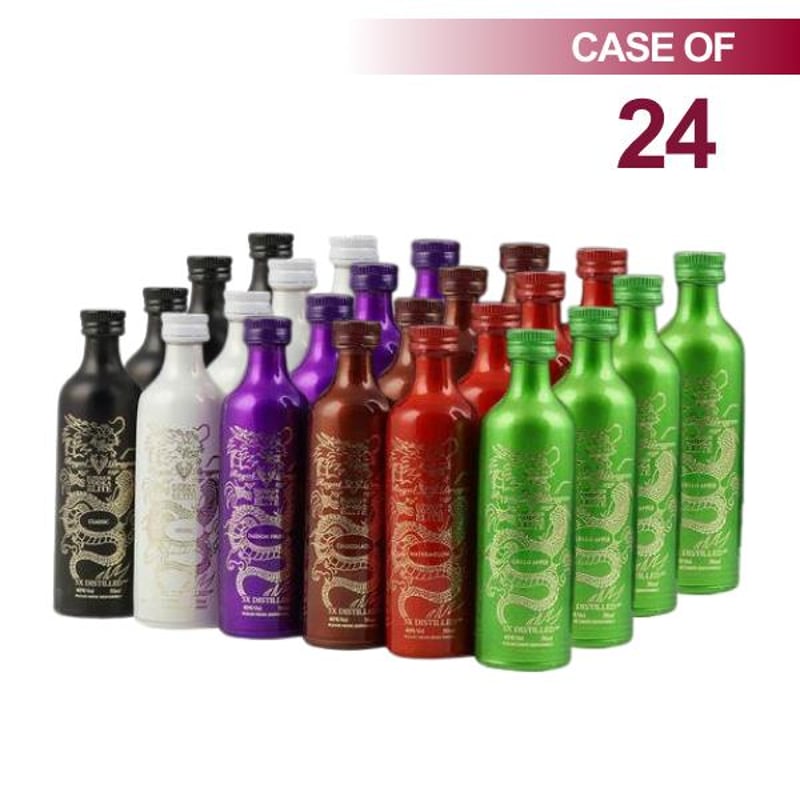 Cocktail Size Mixed Vodka 24 pack includes 4 x 50ml of each flavourChocolate, Lychee, Watermelon, Passionfruit, Green Apple and Classic Black (Case of 24 x 50ml)Five times distilled this super premium Vodka, exclusively distilled with a Russian formula from the finest winter harvest rye.Tasting Note: With a cooling, light, sweet flavour perfect for summery cocktails and eccentric martinis. Very fruity and refreshing vodka with a sweet taste, perfect for your palette. Royal Dragon’s Flavoured Collection is elegant and sumptuous.