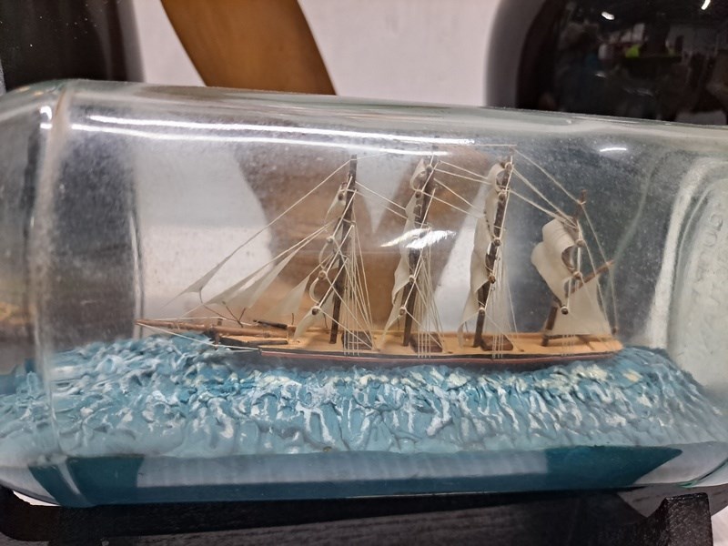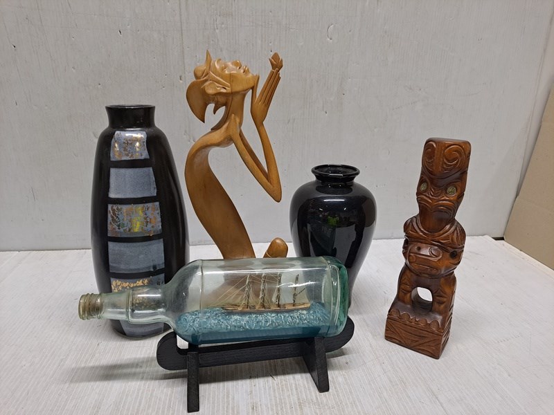 Homewares, including ship in a bottle, vases, timber figurines and more