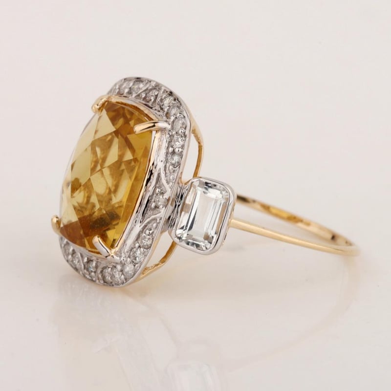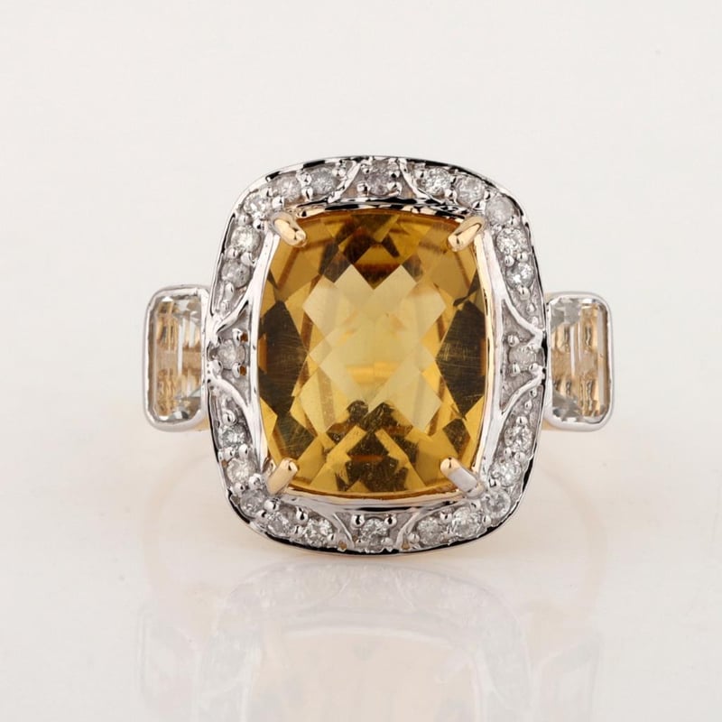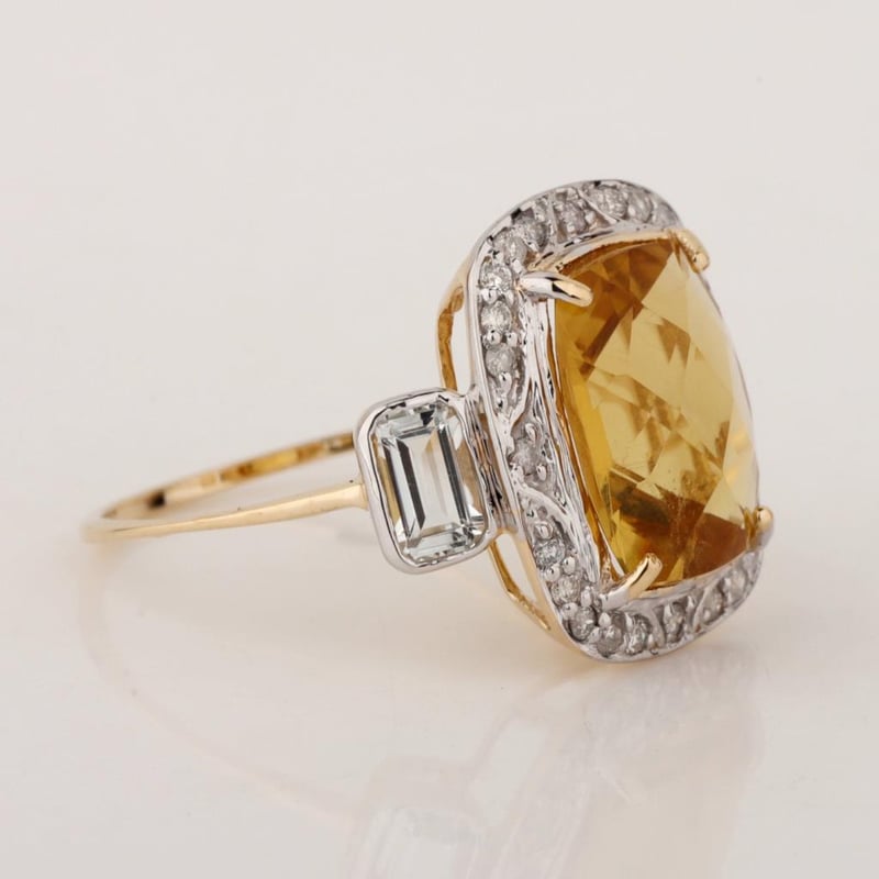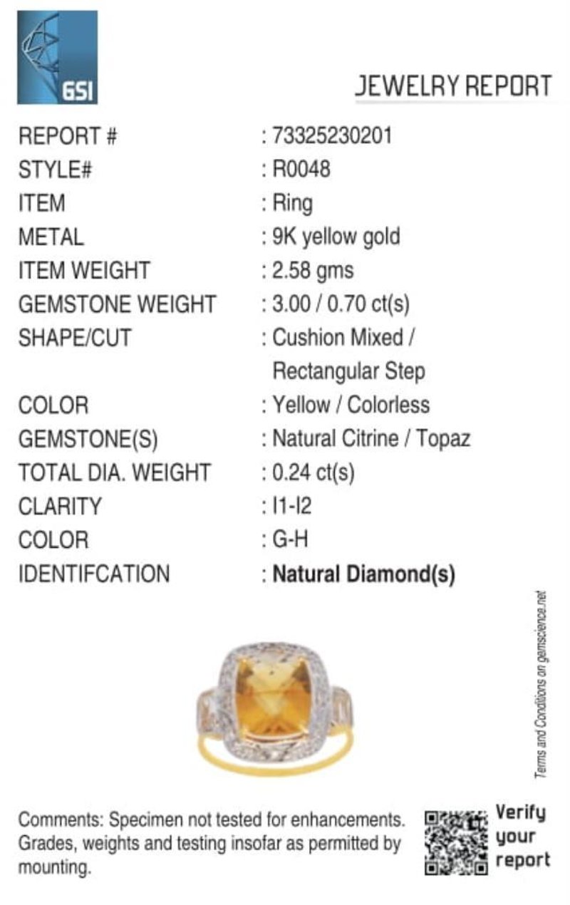 9CT YELLOW GOLD NATURAL CITRINE / NATURAL WHITE TOPAZ & DIAMOND RING Weight Of The Item: 2.58 GFineness Of Metal(S): Yellow Gold 9KtThe Ring Consists Of (1) Cushion Brilliant Natural Citrine & (2) Round Brilliant Cut White Topaz. Surrounding The Main Stones Are Round Brilliant Cut Natural Diamonds.Antique StyleIdentification: Natural Citrine / Natural White TopazColor: Yellow / WhiteShape: Cushion Brilliant Cut / Octagon Faceted CutNo. Of Stone: 3Dimension: 14 Mm X 10 Mm X 8.4 MmWeight: 3 Carats / 0.7 CaratsCut: Very GoodIdentification: Natural DiamondShape: Round Brilliant CutWeight: 0.24 CtsCut: Excellent. Certificates Are Provided By Gemological Science International (Gsi), An Independent Third-Party Gemological Laboratory Based In The Usa And Recognised Among The Top 10 Gem Labs Globally Markings: 9ct Condition: Good - Refer Images 0488238+33