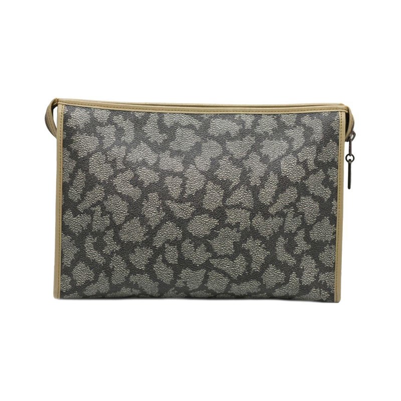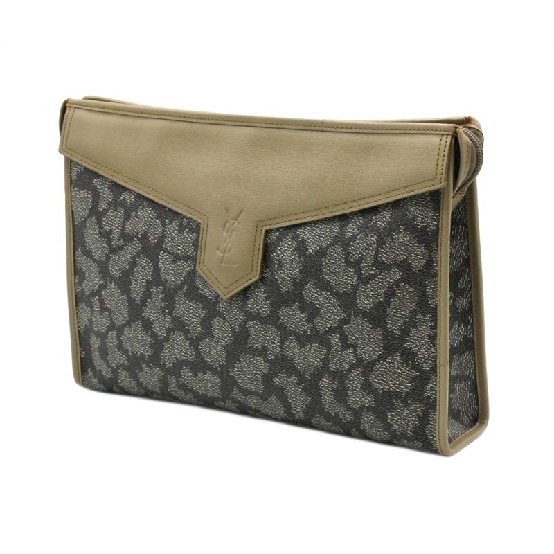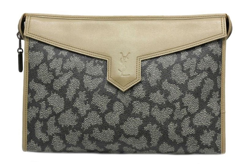 SAINT LAURENT GIRAFFE PRINT COATED CANVAS CLUTCH Length: 30cm Height: 22cm Depth: 6cm Exterior Material Coated canvas and leather trim with gold-tone hardware and top zip closure. Interior Material Textile lining with a main compartment and a zipped pocket. Additional Condition Report - Minor sign of wear on exterior - Moderate scuffs on exterior corners and edges - Minor sign of wear in interior Comes With - Certificate of Authenticity CROSSED DOCKED 155334+36