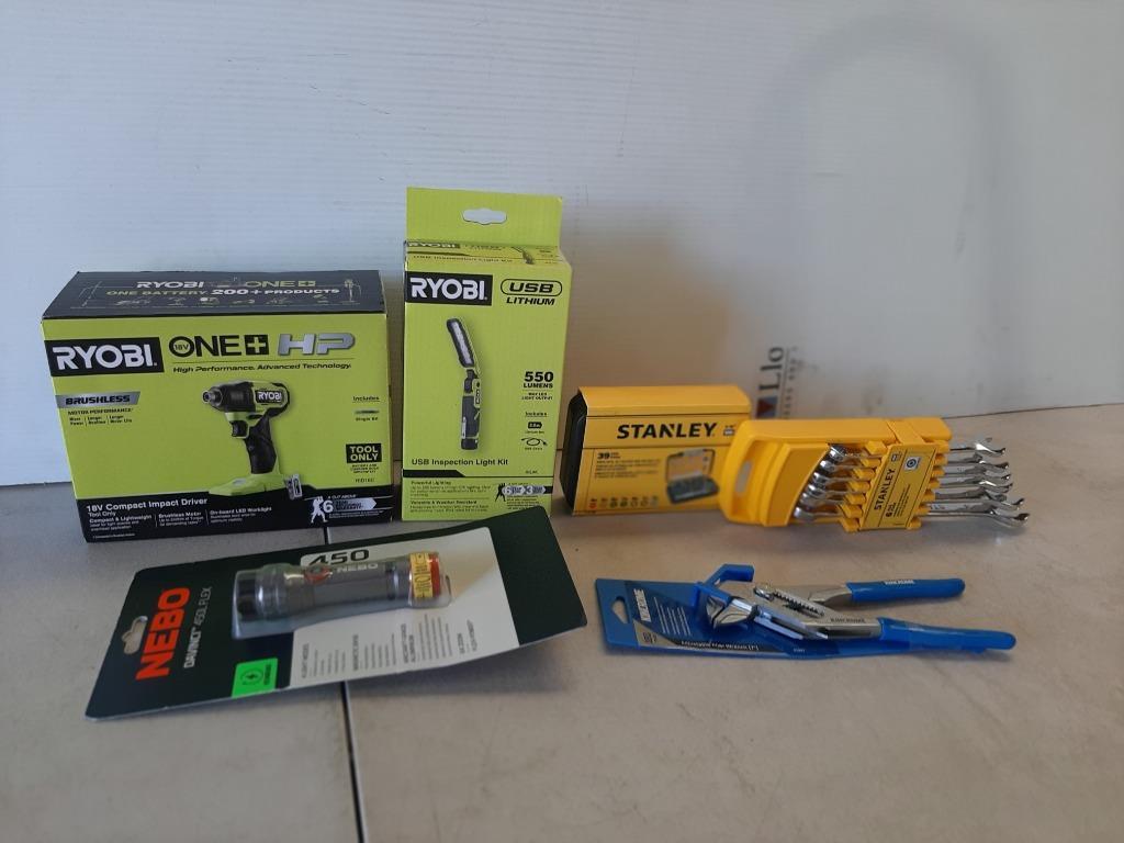 1x STANLEY 39pcs drive bits, bit holder and ratchet set 1/4"mm NEW factory sealed, 1x STANLEY 6pcs combination wrench set NEW factory sealed, 1x KINCROME 180mm adjustable plier wrench 7" NEW factory sealed, 1x NEBO davinci 450l flex flashlight 4 light modes NEW factory sealed, 1x RYOBI USB lithium inspection light kit 550 lumens NEW factory sealed, RYOBI ONE+ HP 18v compact impact driver tool only NEW factory sealed