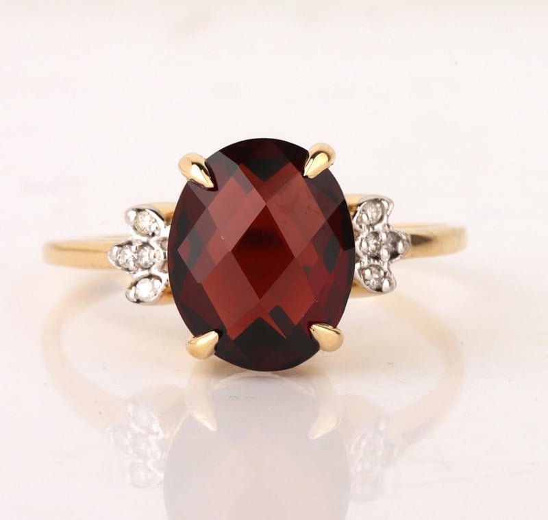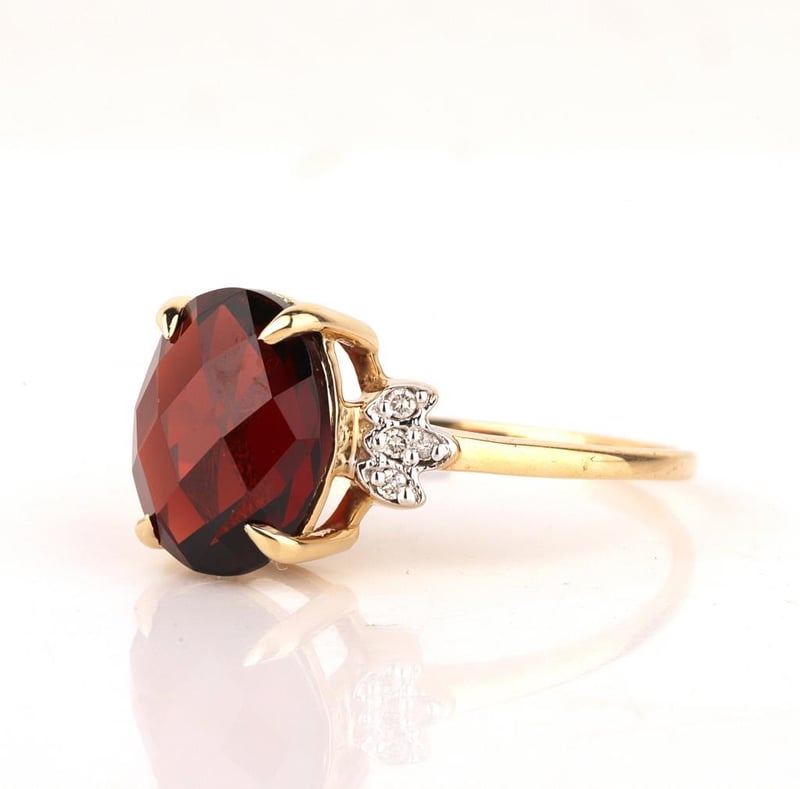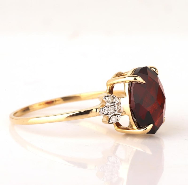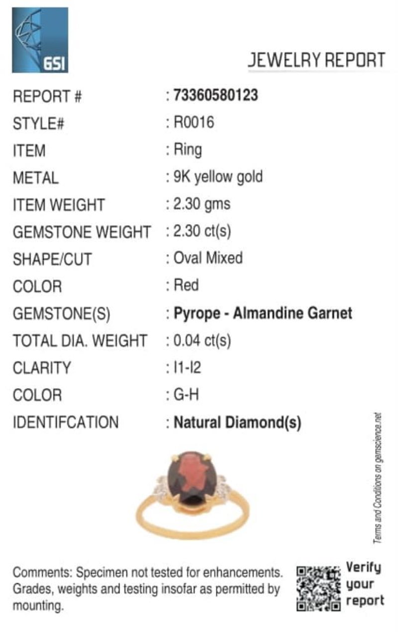 9CT YELLOW GOLD NATURAL GARNET & DIAMOND RING Weight Of The Item: 2.3 GFineness Of Metal(S): Yellow Gold 9KtThe Ring Consists Of (1) Oval Brilliant Natural Garnet. Surrounding The Main Stones Are Round Brilliant Cut Natural Diamonds.Antique StyleIdentification: Natural GarnetColor: RedShape: Oval Brilliant CutNo. Of Stone: 1Dimension: 10 Mm X 8 Mm X 6 MmWeight: 2.3 CaratsCut: Very GoodIdentification: Natural DiamondShape: Round Brilliant CutWeight: 0.04 CtsCut: Excellent. Certificates Are Provided By Gemological Science International (Gsi), An Independent Third-Party Gemological Laboratory Based In The Usa And Recognised Among The Top 10 Gem Labs Globally Condition: Good - Refer Images 0488266+35