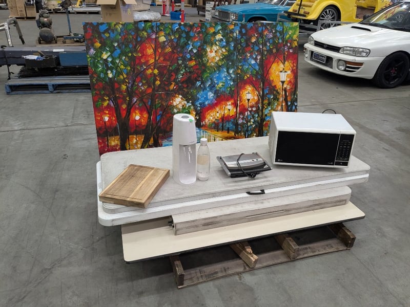 Assorted Homeware & Decorative Items, Foldable & Collapsible Tables, LG Microwave, Soda Stream, Sandwich Press, Food Prep Cutting Board, Decorative Home Painting by A.Fremov