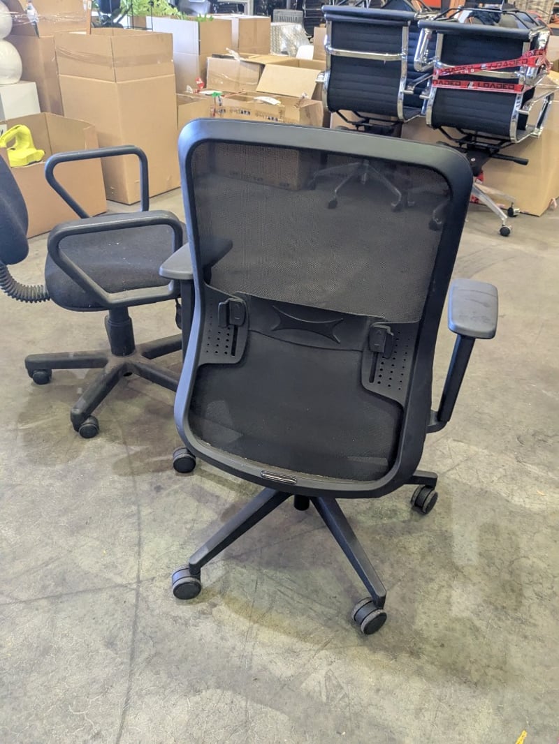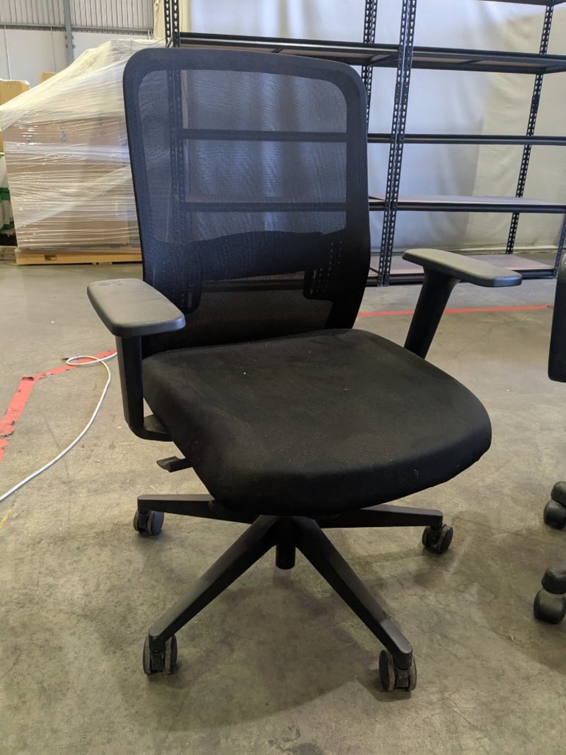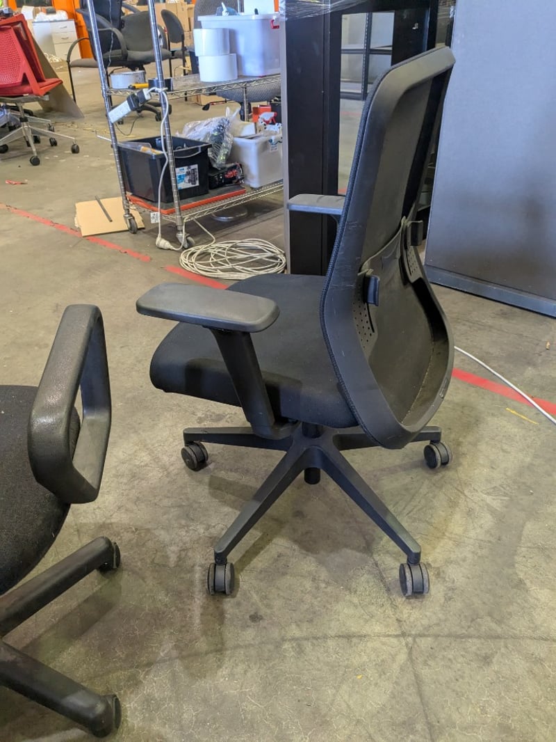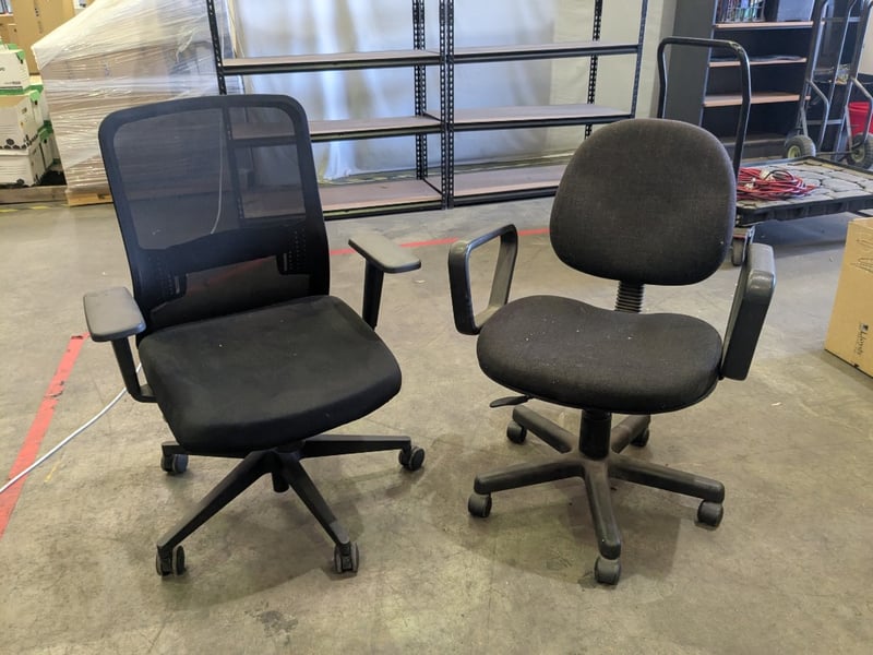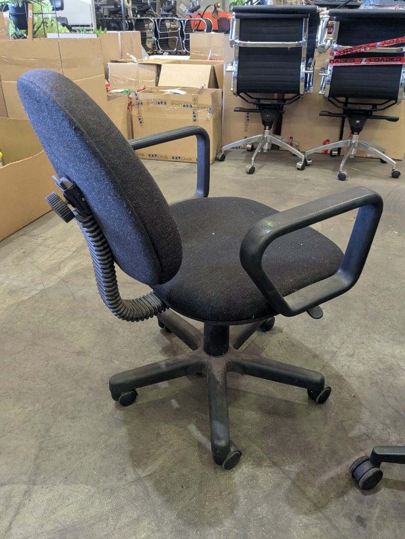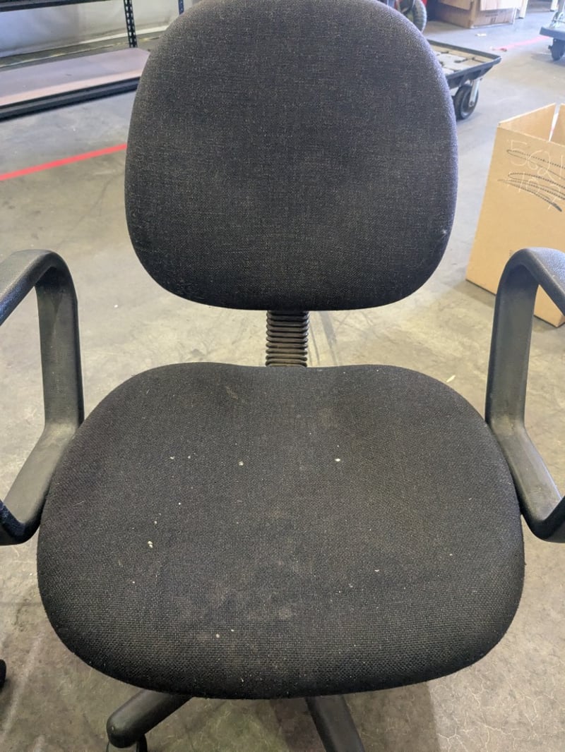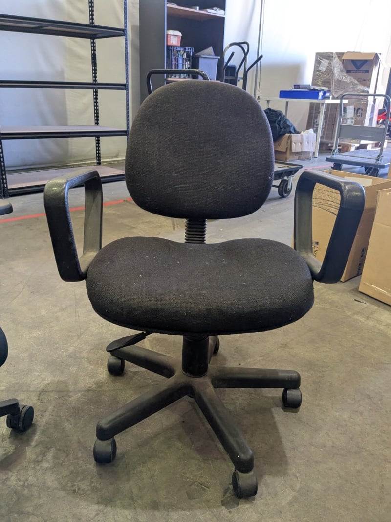 Black office chairs, black fabric, on wheels QTY 2 SOLD AS LOT