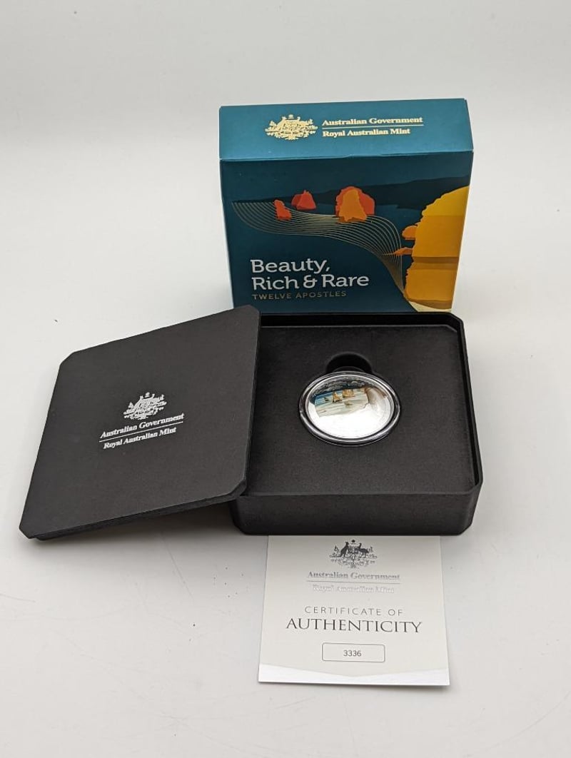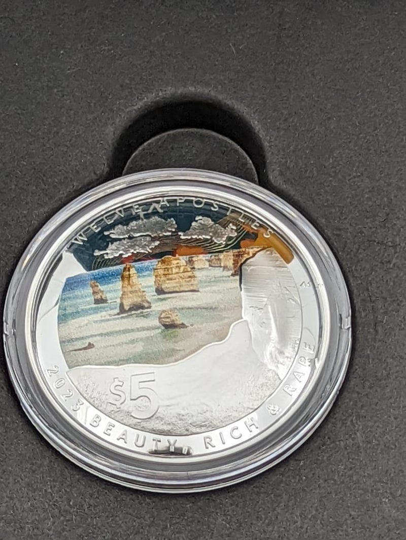ROYAL AUSTRALIAN MINT 2023 BEAUTY RICH AND RARE, TWELVE APOSTLE DOMED COLOURISED 1OZ SILVER $5 COINCondition: Proof235233+28