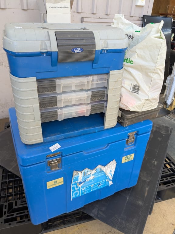 Fishing gear, including 52L cooler box, tackle boxes and more Sold as lot