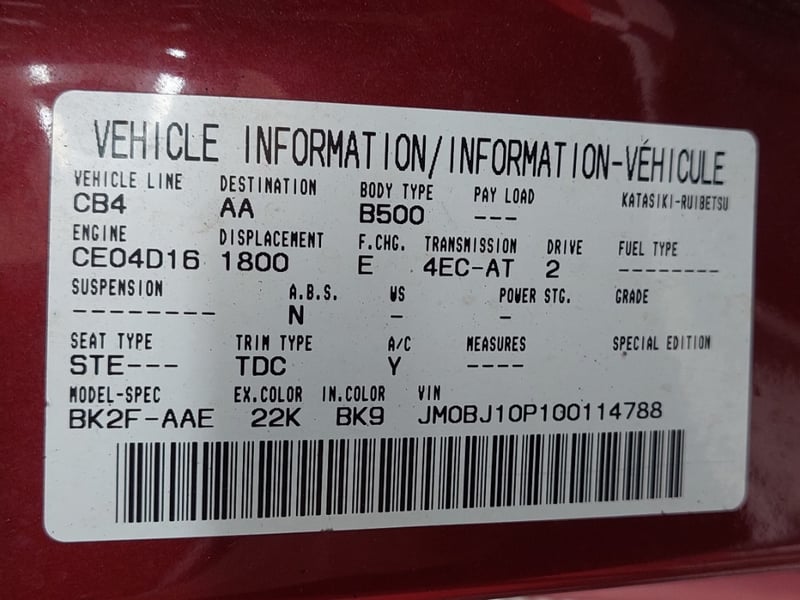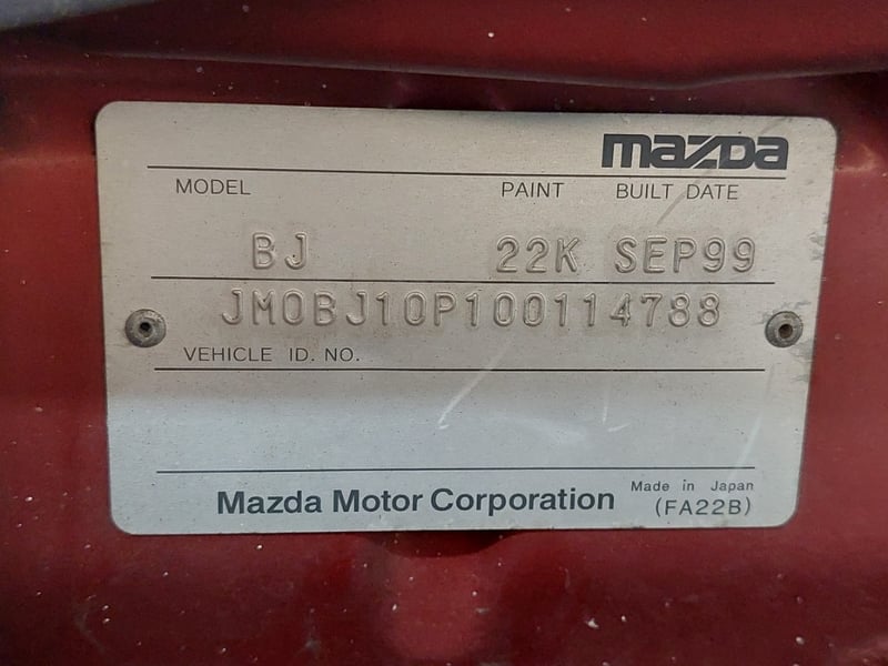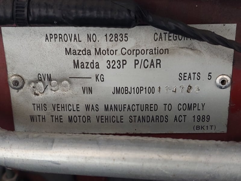 1999 Mazda 323 Anniversary Edition Year: 1999 Make: Mazda Model: 323 Series: Anniversary Edition Body: 5-Door Hatch Drive Type: Front wheel drive Odometer: Indicating 130,331 Kilometres Engine: 1.8 I4 Petrol Transmission: 4-Speed Automatic Colour: Red Seats: 5 Description/extras: Air Conditioning, Power windows, SRS, Tinted windows, Climate control, Alloy wheels, Central locking, Owner's manual. Exterior Paint Deterioration, Rust, Exterior Panel Scratches& Dents, Broken Front Guard Front Right, Interior Upholstery Damage. VIN: JM0BJ10P100114788 ENG No: FP584826 (Key #1B30 Carrara) Lloyd's stock #1042488+1 #PCV