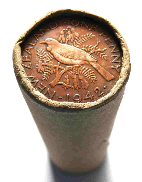ROLL OF 1942 KGVI, NEW ZEALAND PENNY (50X CIRCULATED COINS IN A ROLL).
