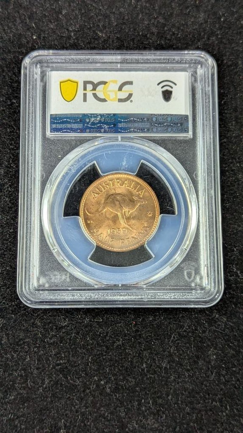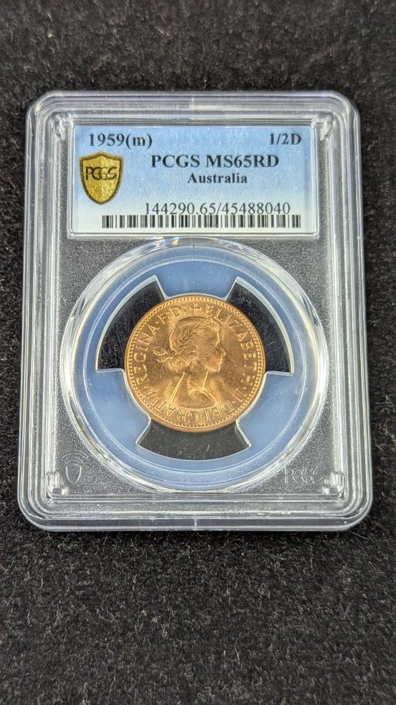 AUSTRALIAN 1959M PCGS GRADED MS65RD HALFPENNY COIN.