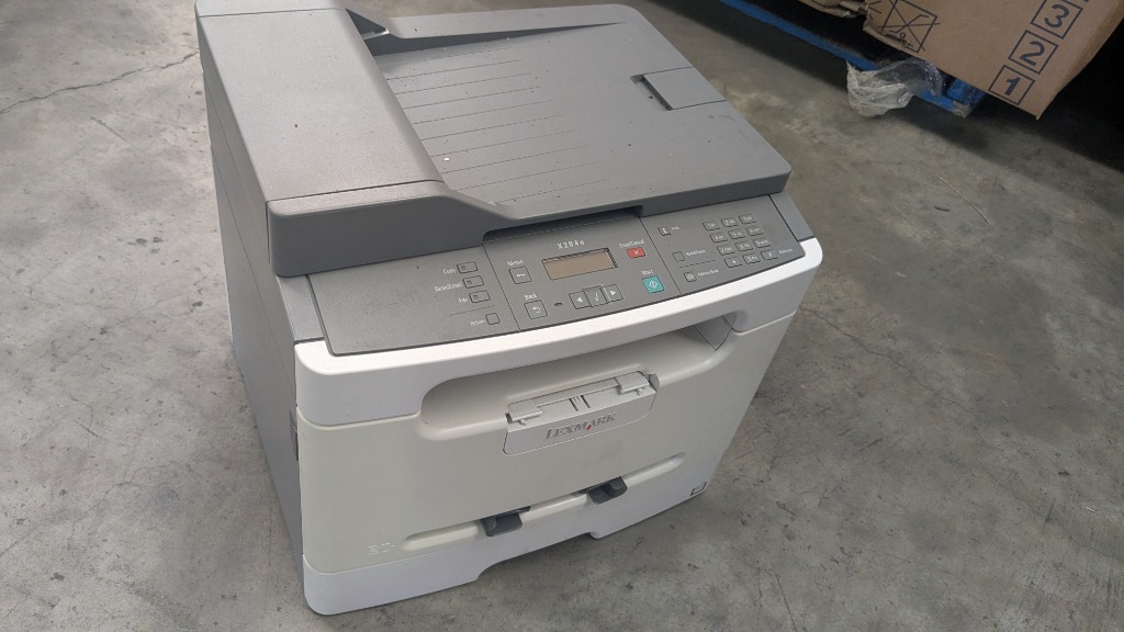 Lexmark multifunction printer, 240v, Scanner, Push Button Control, 2 Tier Paper StorageDimensions: 400mm(W) x 350mm(D) x 370mm(H) NOTE: INSPECTIONS HIGHLY RECOMMENDED, NO POWER CABLE