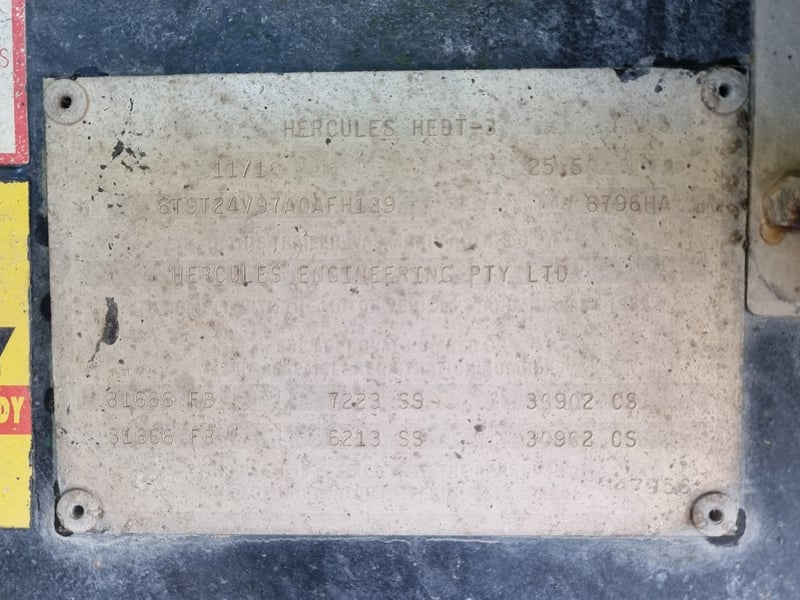 2010 Hercules HEDT-3 Tri-axle Tipper Dog Trailer Year: 2010 Make: Hercules Configuration: Tri-Axle, Tipper VIN: 6T9T24V97A0AFH189 Model: HEDT-3 Dog Trailer Dimensions: 5500mm L x 2500mm W Approx (drawbar length 4300mm) Suspension: Airbag ATM: 25.5 Tonne Notes: Electric tarp, rock sheets, Airtech dual weigh scales, chute For more information Contact: 0489 996 389 or Email: [email protected]
