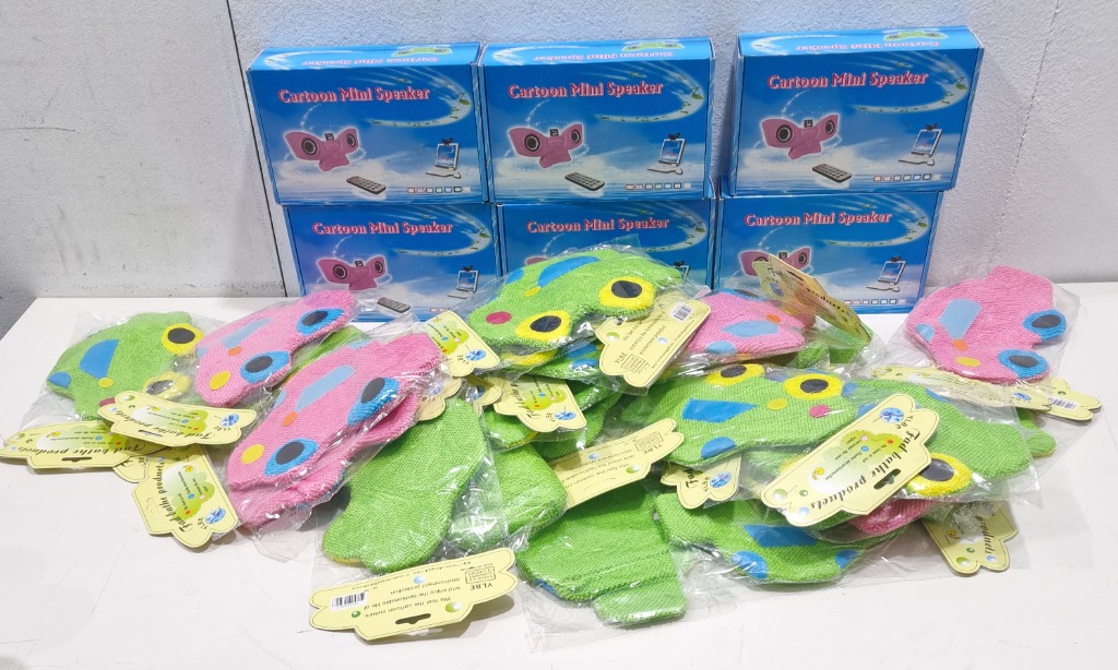 Assorted childrens homeware lot, includes cartoon mini speakers and childrens bathing mits (various designs) Sold as lot
