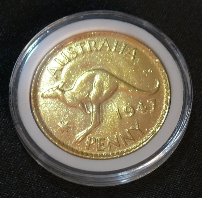 1947 KGVI UNCIRCULATED 18CT. GOLD PLATED AUSTRALIAN PENNY IN PROTECTIVE CLEAR CAPSULE.