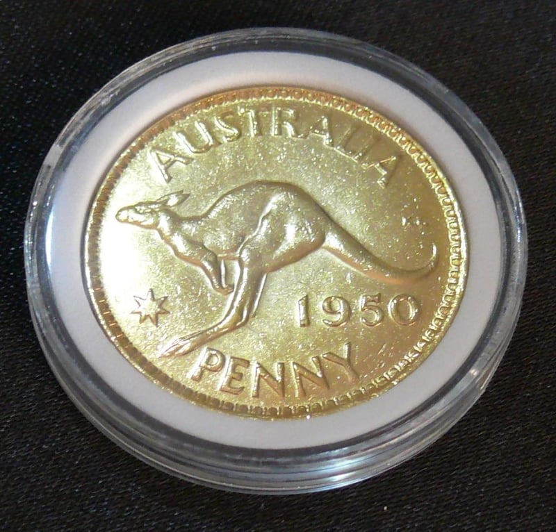 1950 KGVI UNCIRCULATED 18CT. GOLD PLATED AUSTRALIAN PENNY IN PROTECTIVE CLEAR CAPSULE.