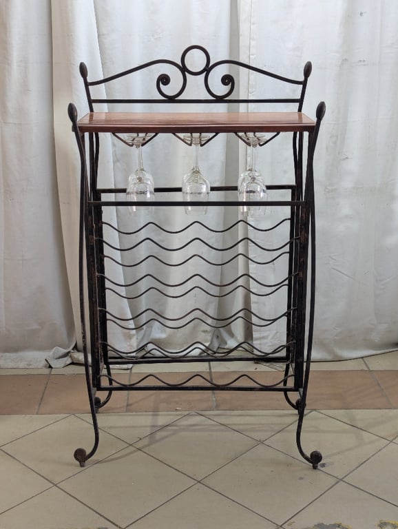 Wine rack with 6 glasses, cast iron frame, timber top, glass wine glassesDimensions: H 123cm x W 68cm x D 35cm