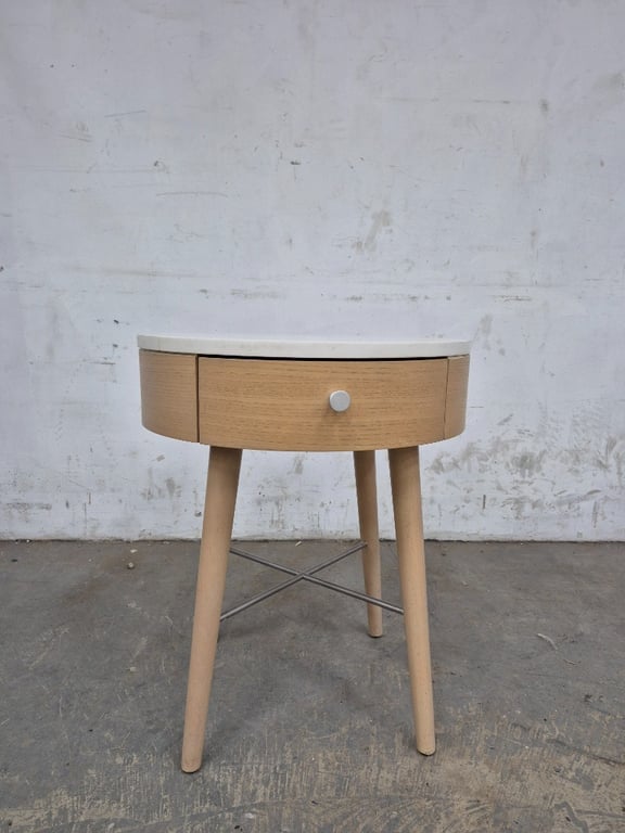 Timber round table with white finish top and drawer Note: Possible Signs of Wear and Tear BID PER EACH MUST TAKE 2