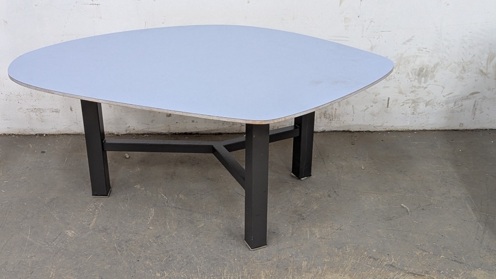 Coffee table, blue finish top, grey finish metal frame Dimensions: H 46cm x W 114cm x D 75cm Note: Possible Signs of Wear and Tear BID PER EACH