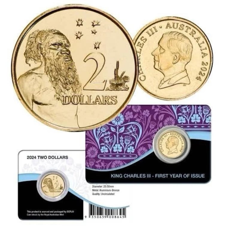 AUSTRALIA $2 COIN THE FIRST YEAR OF ISSUE KING CHARLES COMMEMORATIVE CARD - UNC