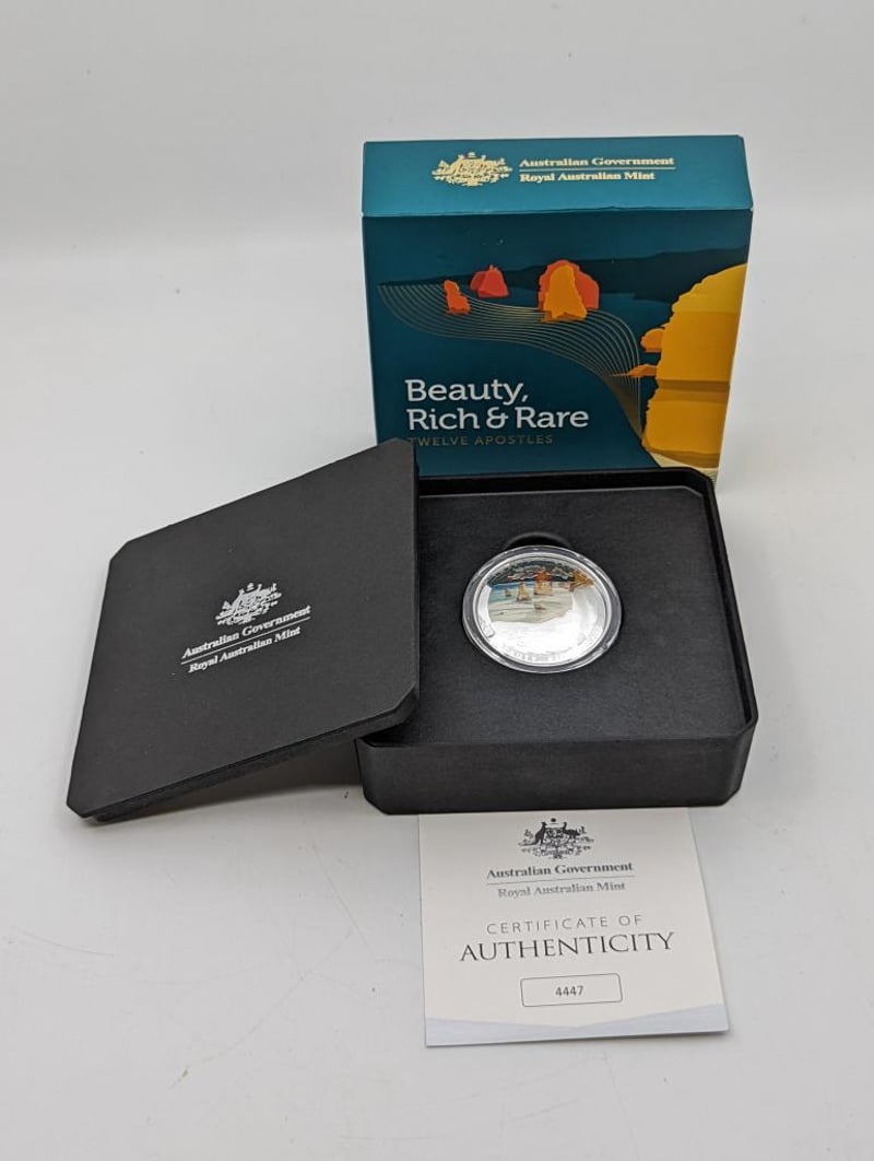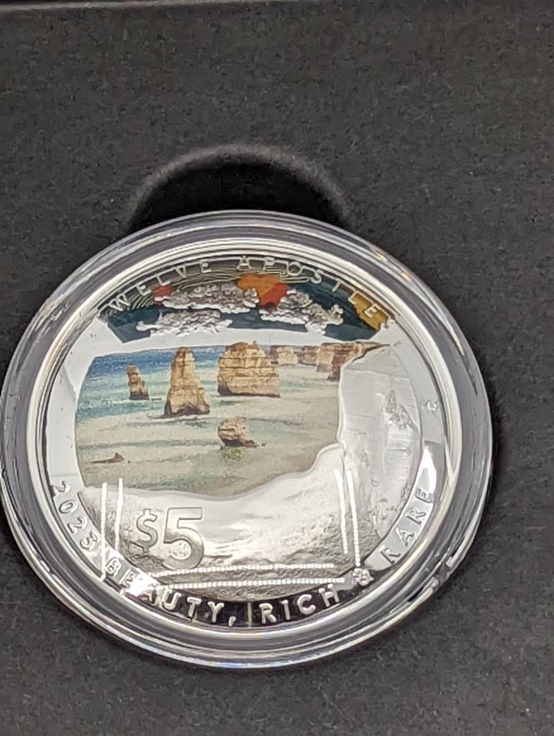 ROYAL AUSTRALIAN MINT 2023 BEAUTY, RICH & RARE TWELVE APOSTLE DOMED COLOURISED 1OZ DOMED SILVER $5 COIN. Condition: Proof235247+28