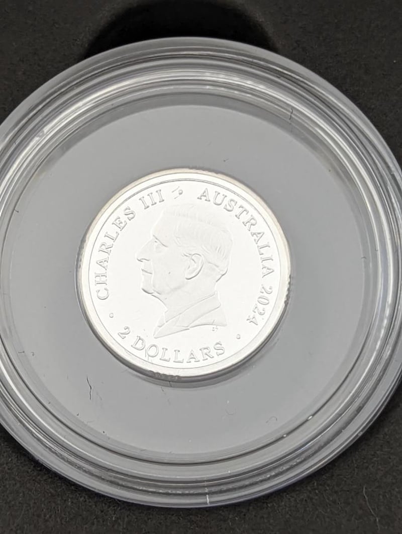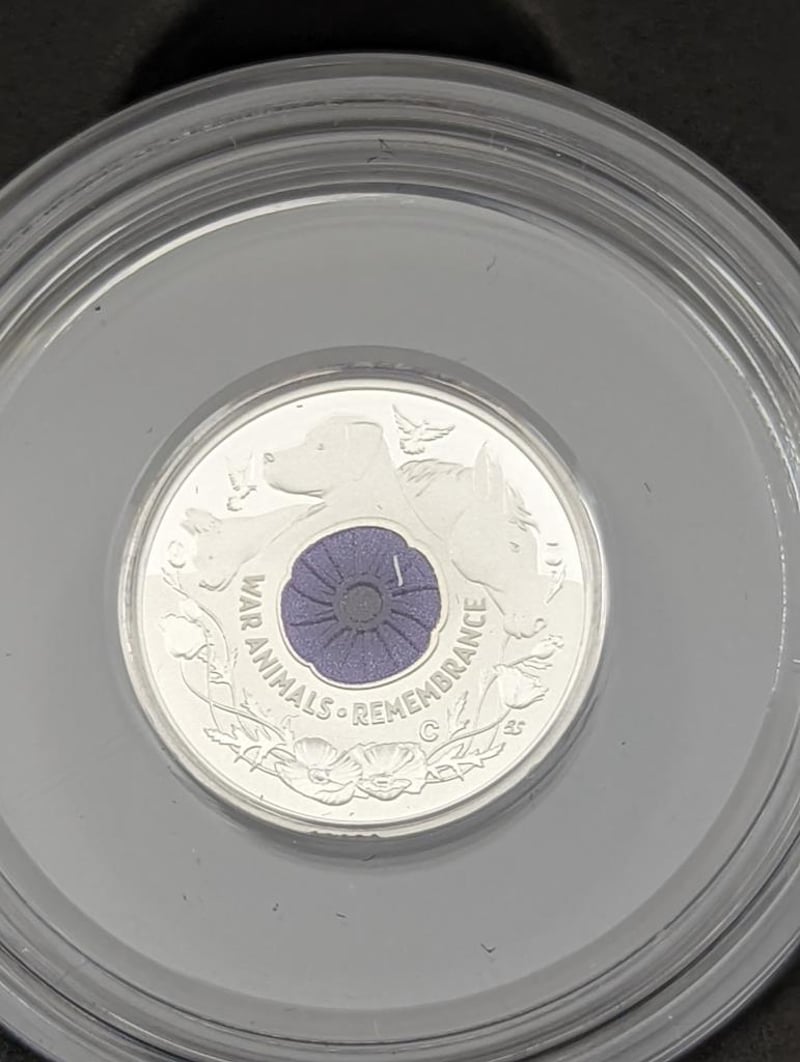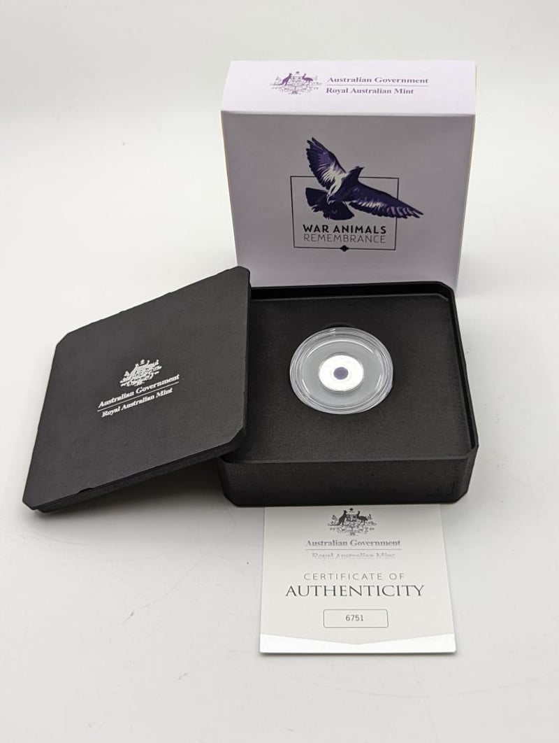 ROYAL AUSTRALIAN MINT 2024 WAR ANIMALS-REMEMBRANCE PURPLE COLOURED SILVER COIN. Condition: Proof235247+38