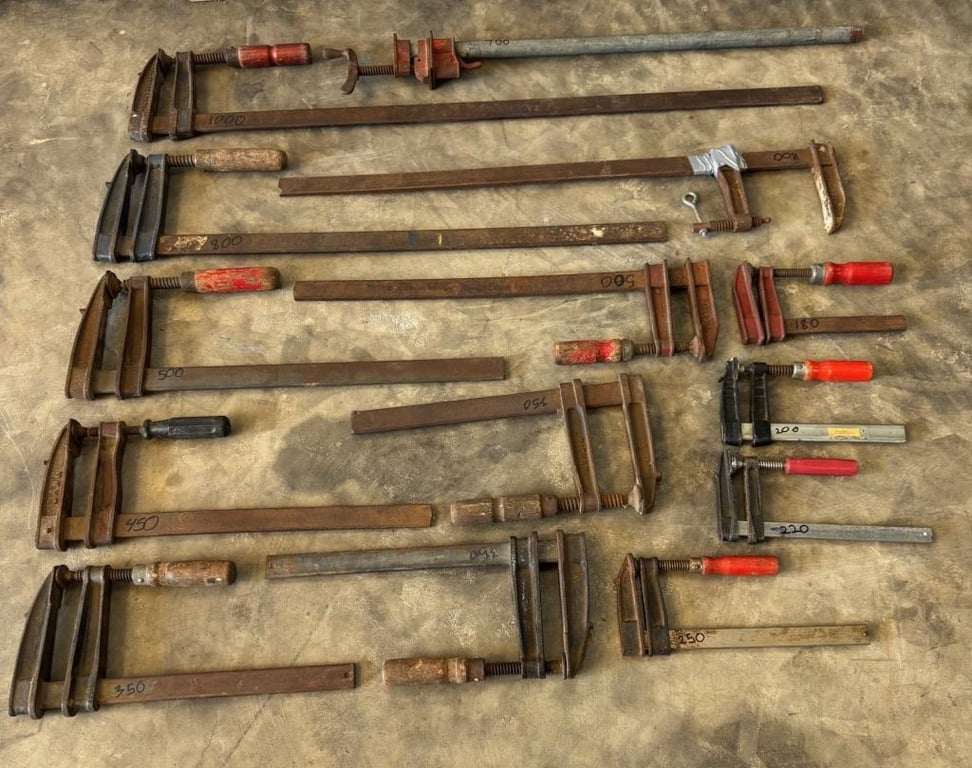 13 x F Clamps various lengths: 1x 1000mm, 2x 800mm, 2x 500mm, 1x 450mm, 3x 350mm 1x 250mm, 1x 220mm, 1x 200mm, 1x 180mm plus 1x Pipe Clamp 700mm