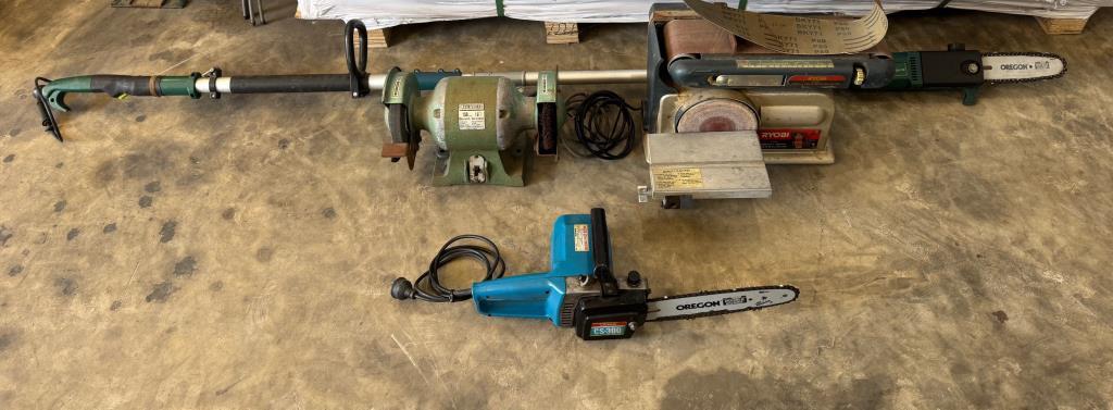 Miscellaneous tools. 1x 240V Gardenline pole chainsaw with Oregon Bar. 1x 240V Ryobi chain saw with Oregon bar, 1x 6"Bench Grinder with grinding wheel and wire brush, 1x Ryobi belt disc sander 100x 150mm and spare belt.