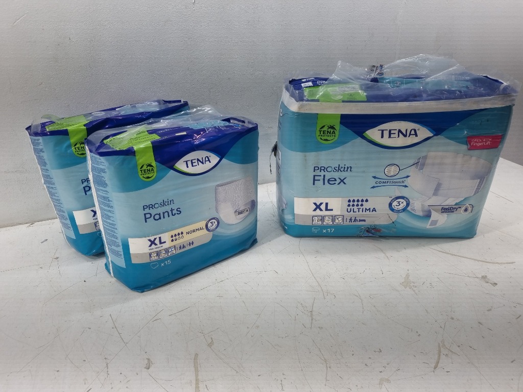 Tena Proskin Pants, Includes 2x Packs of Normal Size XL 120-160XL 15x Per Pack, And Proskin Flex Ultima Size XL Pack of 17x Sold As lot