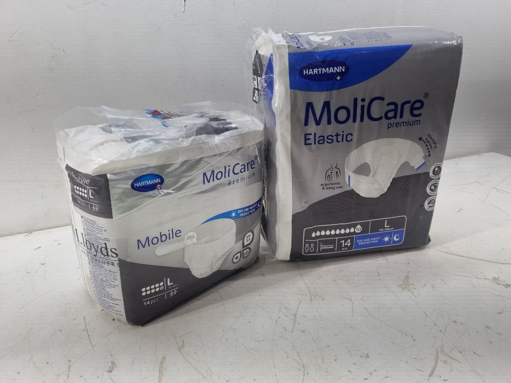 Molicare Incontinence Pants, Includes 14pack of Size L 100-150cm, Mobile pants and 14pack of Premium Elastic Size L 115-145cm PantsSold As Lot
