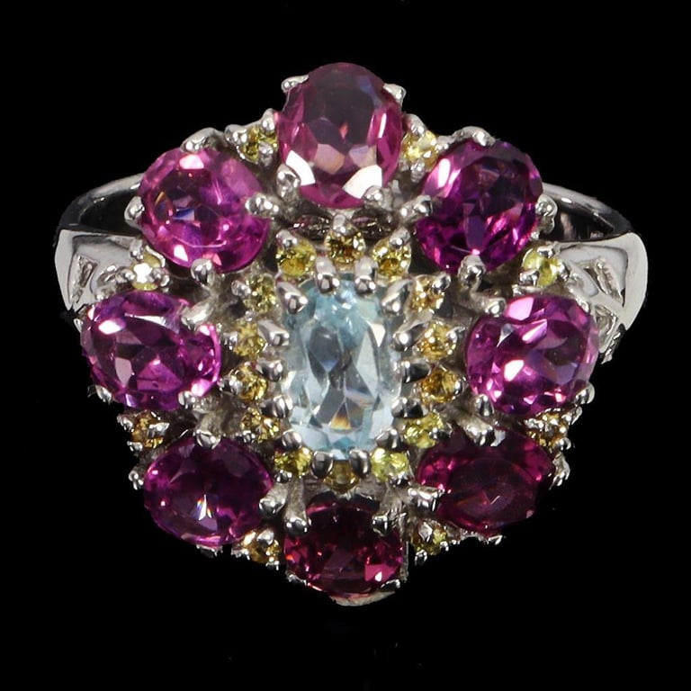 NATURAL SAPPHIRE TOPAZ & GARNET RING Natural Sapphire Topaz & Garnet Ring. Made In Solid Sterling Silver And Plated In14K White Gold. Features All Natural Sky Blue Topaz, Fancy Sapphire And Rhodolite Garnets. Ring Size 9 Condition: Good - Refer Images 0488241+11