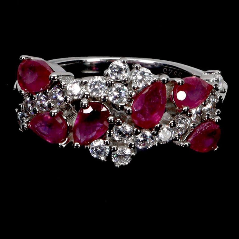 NATURAL RUBY RING Natural Ruby Ring. Made In Solid Sterling Silver And Plated In14K White Gold. Features Natural Pear Facet Red Rubies Surrounded By Sparkling Czs. Ring Size 8.5 Condition: Good - Refer Images 0488241+12