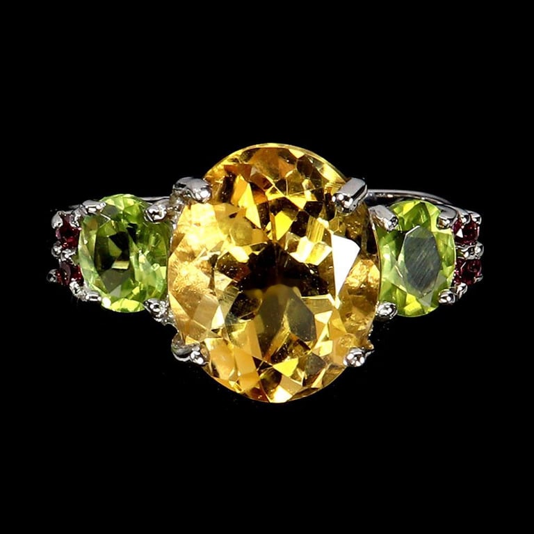 NATURAL CITRINE & PERIDOT RING Natural Citrine & Peridot Ring. Made In Solid Sterling Silver And Plated In 14K White Gold. Features Natural Green Peridot, Natural Golden Citrine And Natural Rhodolite Garnets. Ring Size 7.5 Condition: Good - Refer Images 0488241+17