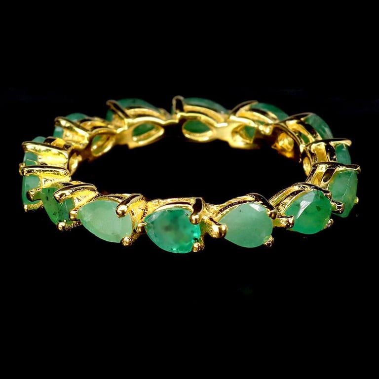 NATURAL EMERALD ETERNITY RING. Natural Emerald Eternity Ring. Made In Solid Sterling Silver And Plated In14K Yellow Gold. Features Natural Pear Facet Green Emeralds. Ring Size 8.5 Condition: Good - Refer Images 0488241+26