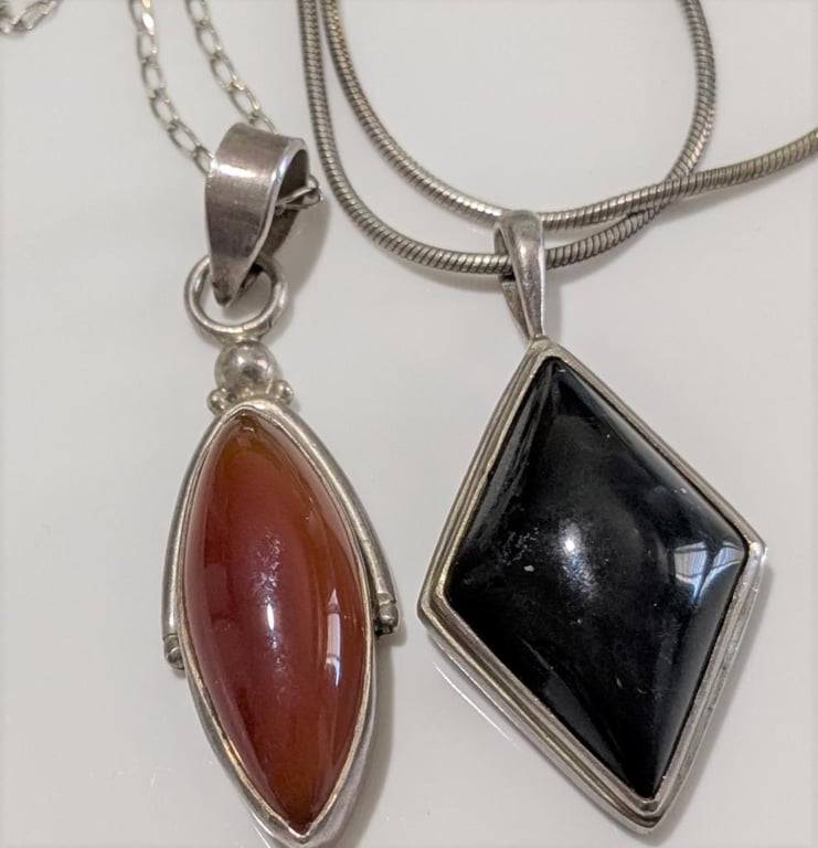STERLING SILVER PENDANTS FEATURING CANELEAN & VERY DARK BLUE TIGER'S EYE, BOTH PENDANTS & CHAINS MARKED 925 Condition: Good - Refer To Images +20