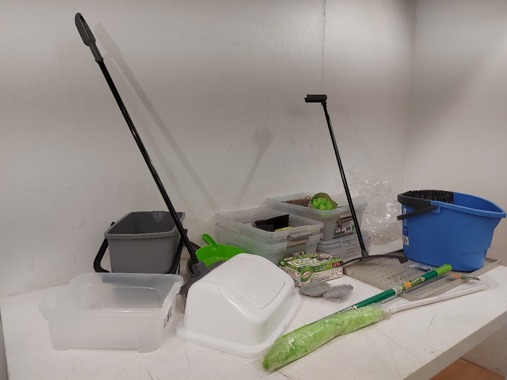 Assorted Cleaning Lot Includes Latex Disposable Gloves, Dust Pan And Bushes, Mop Bucket, And More, Quantity 15 Sold As Lot
