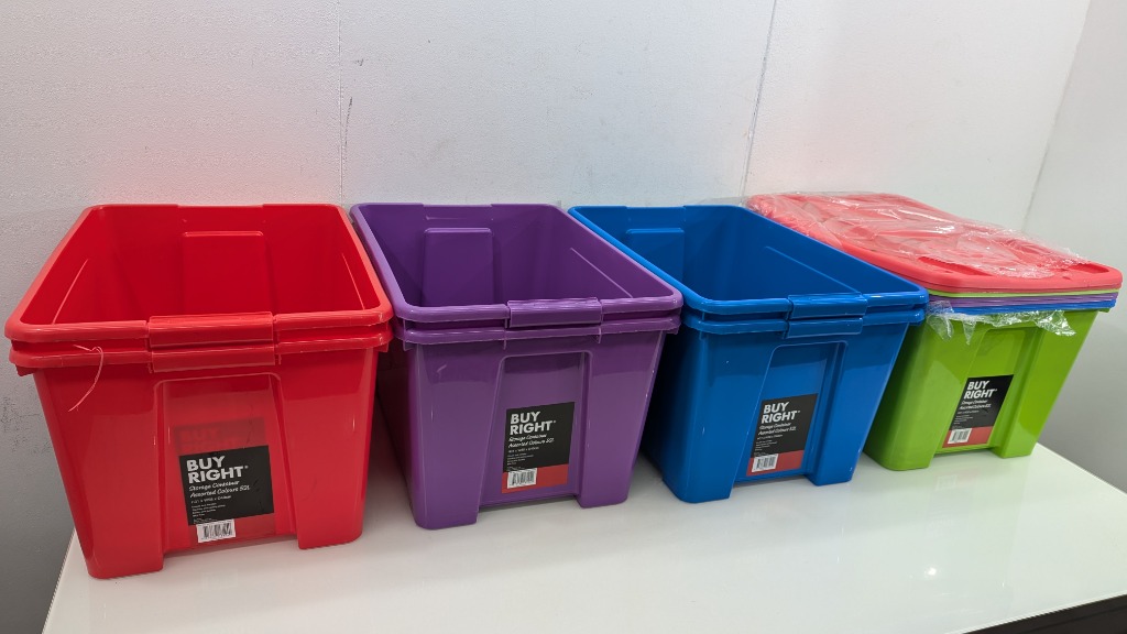Storage Containers, But Right, 62 Litre, With Lid, Assorted Colours, Dimensions 31cm(H)×58cm(W)×40cm, Quantity 7 Sold As Lot