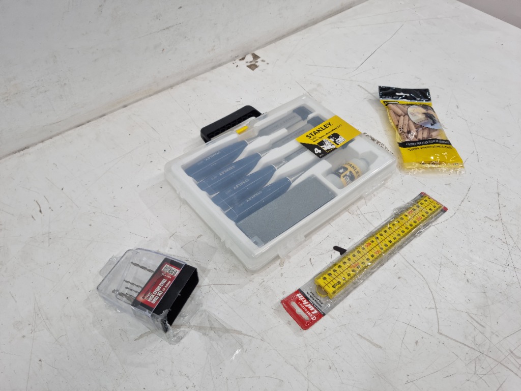 Stanley 4x Chisel and Sharpening Stone Kit, 1m Folding Ruler, Fluted Dowels And More Sold as Lot