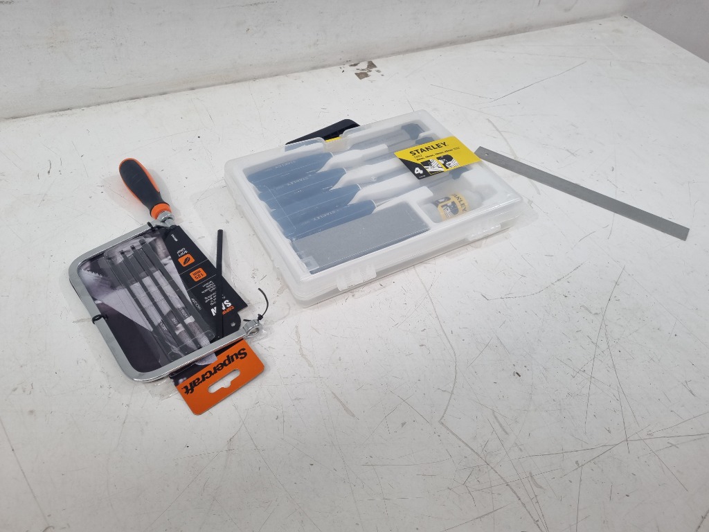 Assorted Tools, Includes Coping Saw With Spare Blades, Stanley 4x Chisel Kit and 30cm ruler Sold as lot