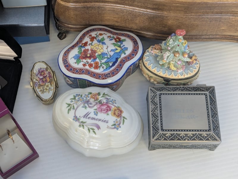 Jewellery, including tricket boxes, silver and gold style pieces some with stamps - refer to images